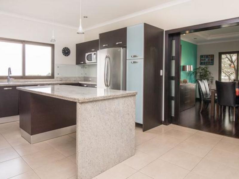 First floor: The hall of the house offers a brightly colored wall that greets you as you enter. To the right, a hallway leads to the guest bathroom and finally to the living room. This area has a beautiful fireplace and direct access to the terrace, where a landscaped garden welcomes you. To the left of the lobby, the formal dining room offers a comfortable area with large windows and contoured ceilings that add to the dining experience. On the one hand, the sliding wooden doors open to the kitchen, a feature that provides privacy when desired, but also offers the opportunity for a built-in area that is very practical for social events. The home's kitchen has a center island with beige and brown granite countertops, as do the rest of the granite kitchen countertops and custom kitchen cabinets.