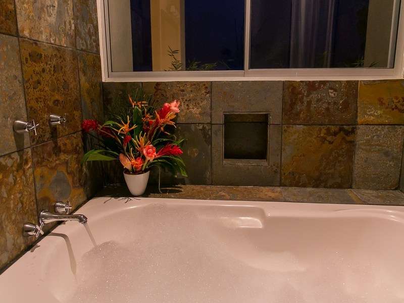 All four bedrooms have queen size beds, air conditioners, ceiling fans, and en-suite bathrooms with marble counters and top quality fixtures. Three of the bedrooms are in the main house; the fourth is in a separate studio apartment perfectly set up for guests needing special access or kids who you want to give a little separation from everyone else.