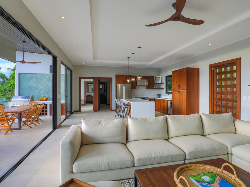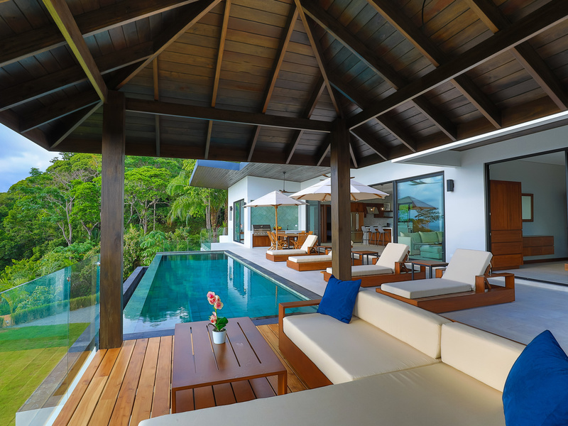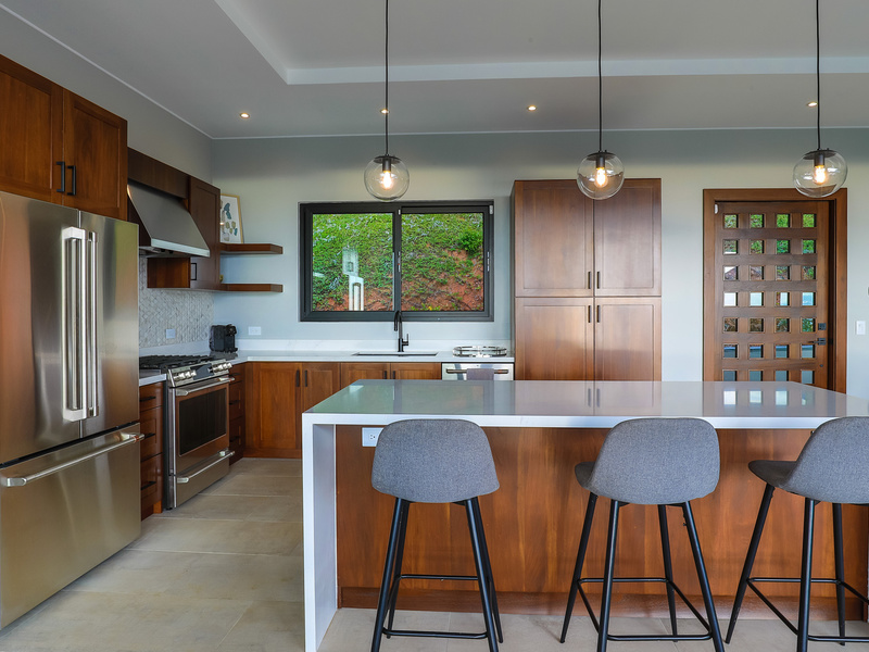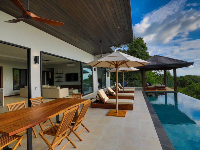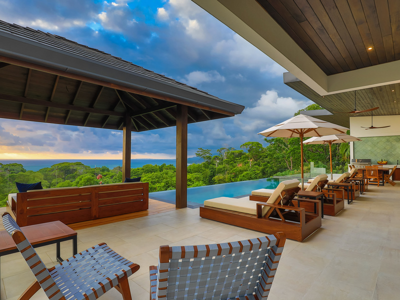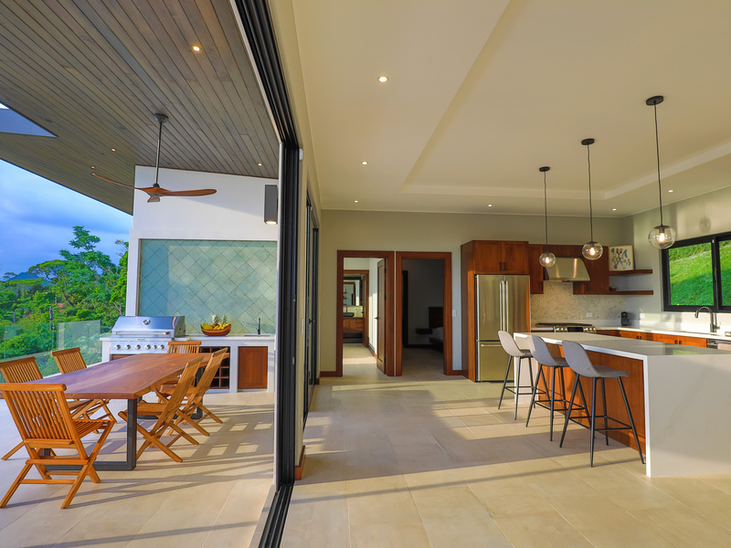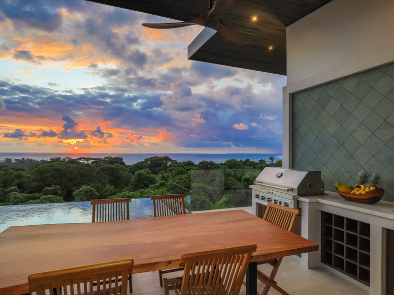 The jewel of the home is the outdoor living area. It sits elevated over the jungle canopy featuring a 40 ft long Balinese stone infinity pool, outdoor grill area with built-in Kitchen Aid grill/prep sink/ and custom-made Guanacaste wood table with seating for 8.