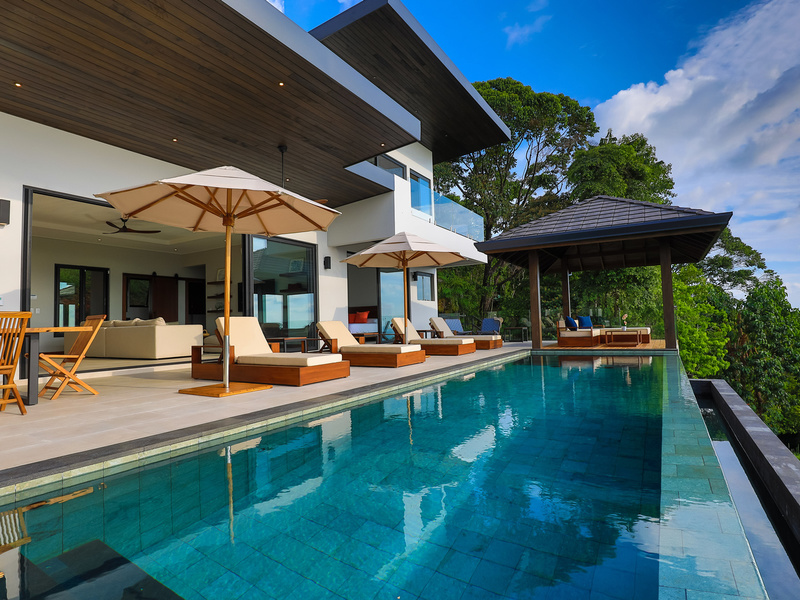 The Indonesian inspired palapa, complete with teak sectional sofa, teak flooring, and umbrella cushions is the perfect spot for enjoying the evening sunset with a glass of wine.