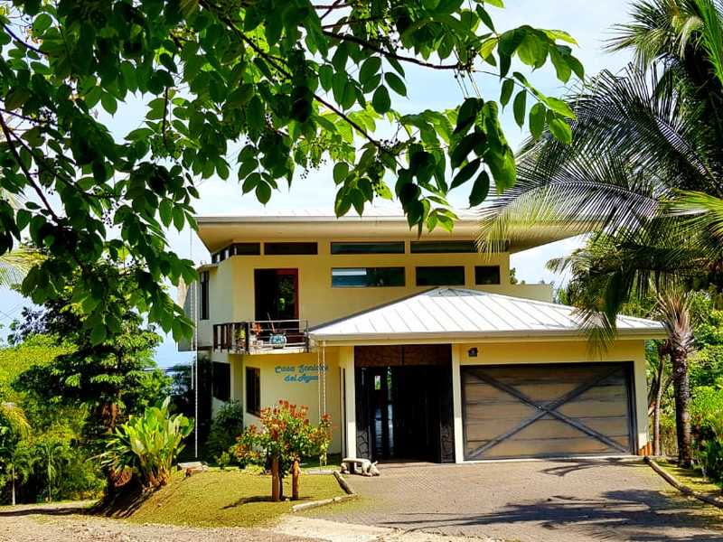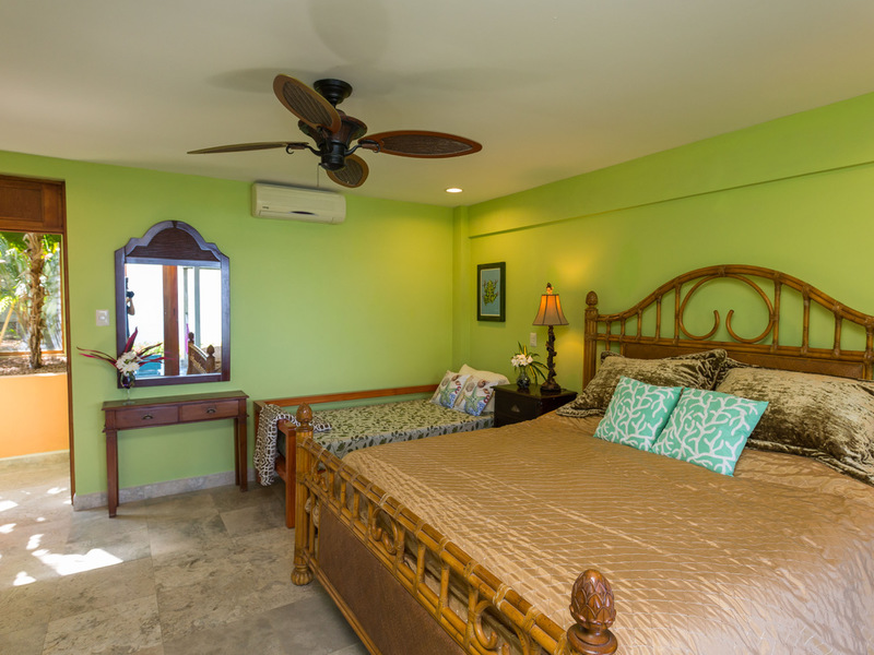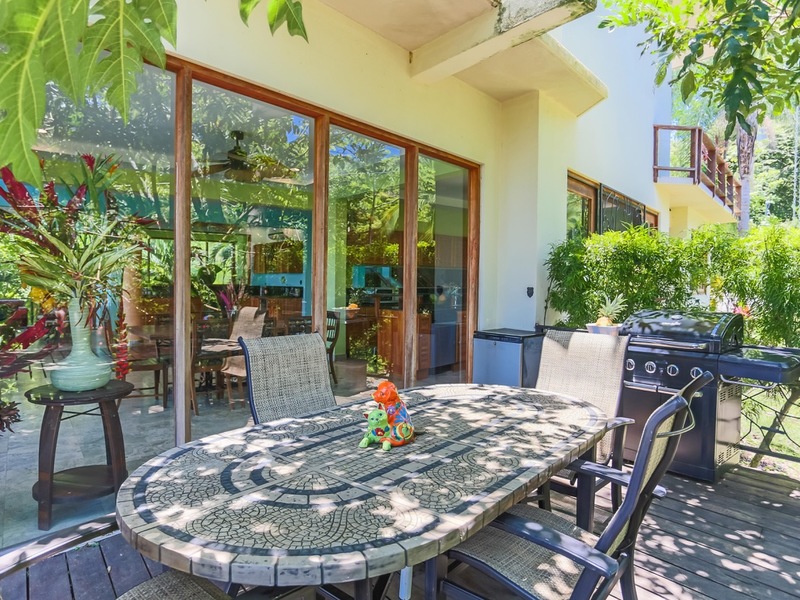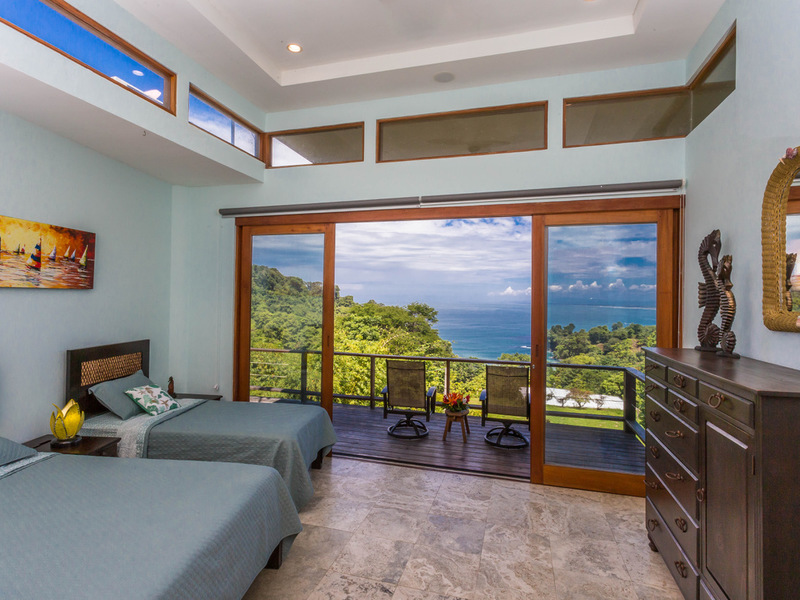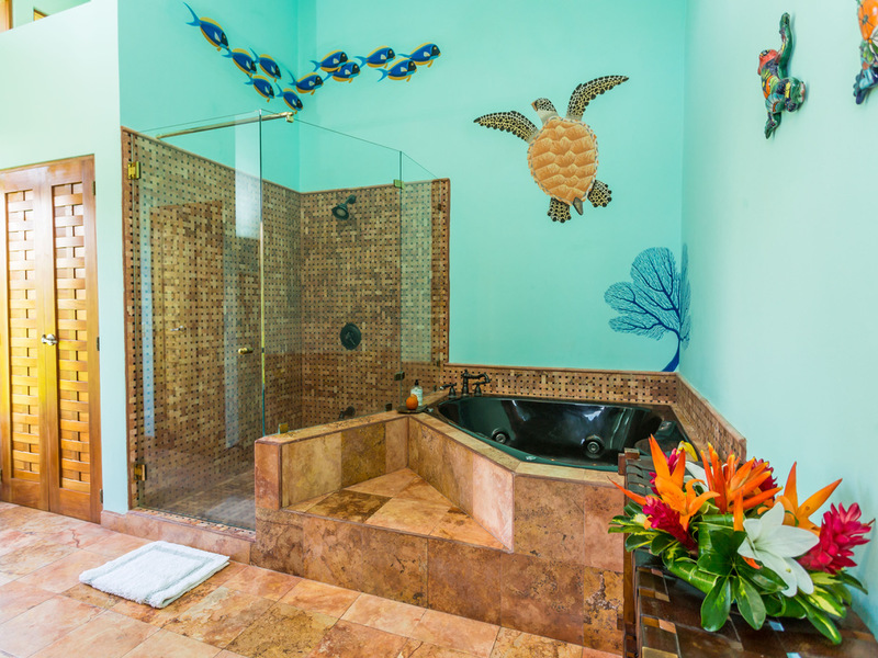 There is a water feature and cascades within the home and a hardwood raised platform above the water that leads you out to the stunning views. The main level hosts a beautiful cooks kitchen, spacious dining area which spills out onto the pool deck, a wet bar, and living area. The home is designed to open up all the doors and live indoors and outdoors while you marvel at all the beautiful views. the top level of the home hosts three spacious bedrooms, including twin ocean view masters, each with its own private almond wood terraces and en-suite baths. The third bedroom is a spacious jungle view room, equipped with multiple beds and bunks making it a great kids' room, and is complete with its own tropical bath. the 4th bedroom is located on the garden level of the home and is a stunning suite on its own, with full private bath.
