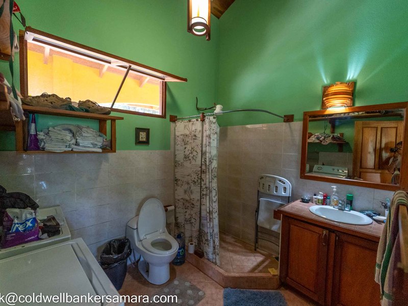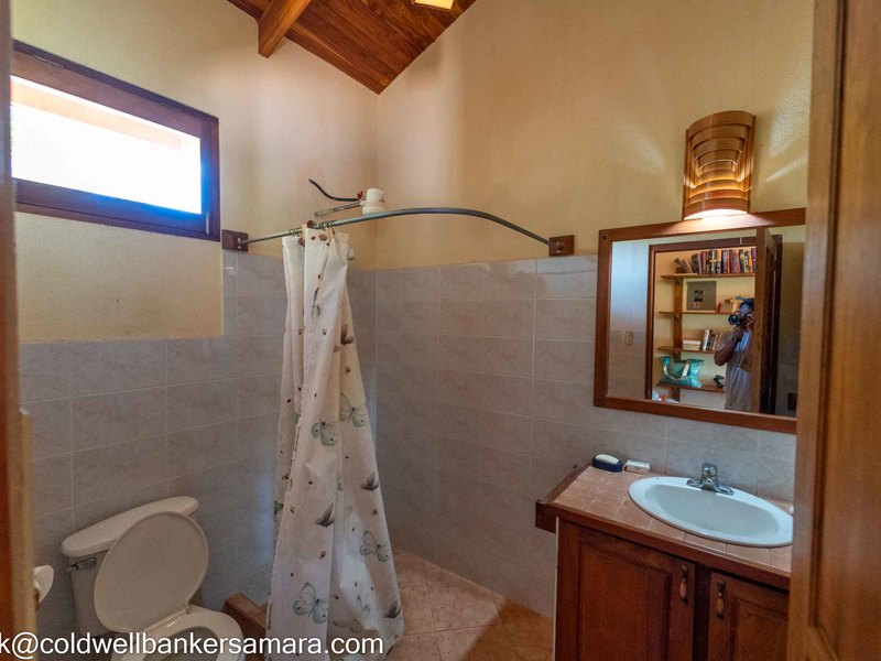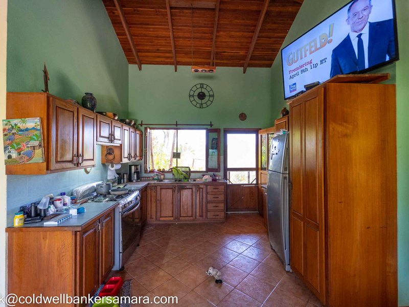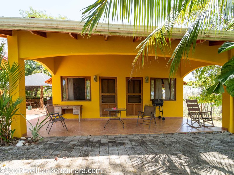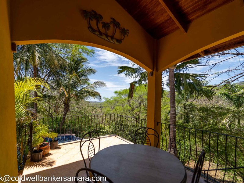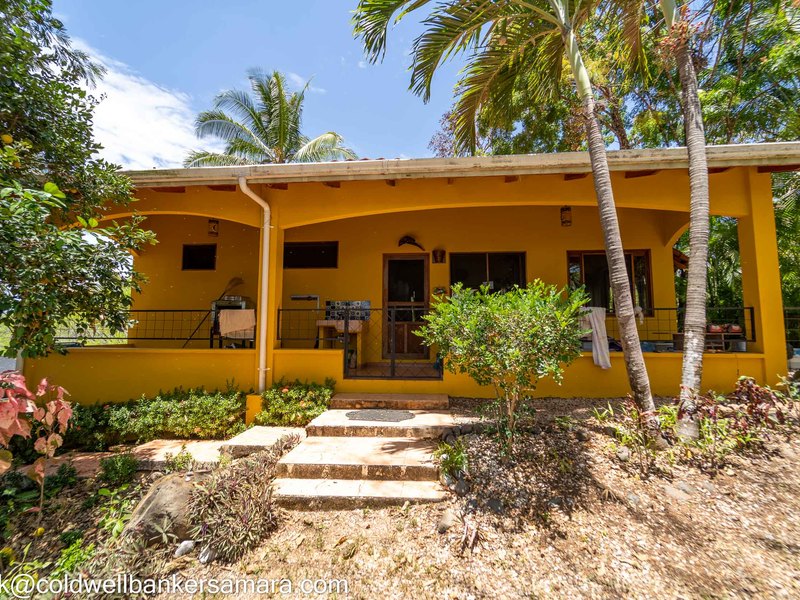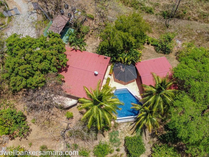 This solid concrete built home comes fully furnished and has 2BR/2BA, living area, kitchen and a large oversize terrace overlooking the mountains and trees. Next to the home there is a large “V” shaped pool and BBQ area and after that 2 apts, each one has a balcony, one bedroom and on suite bathroom. Surrounded by lush Guanacaste trees and an abundance of wildlife such as monkeys, coatis, and birds.