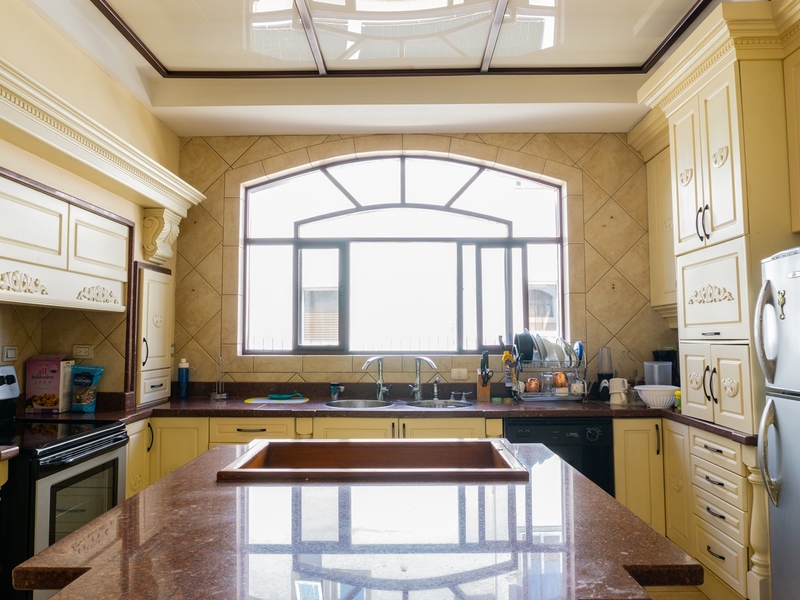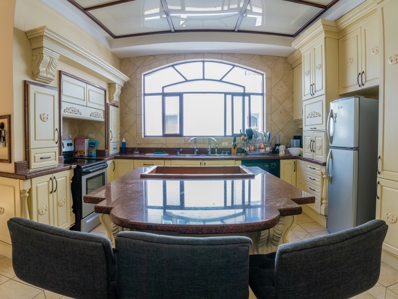 Al otro lado del primer nivel encontrarás una preciosa cocina con mucho espacio de almacenamiento, una isla central, sobres de granito, agua caliente instantánea, desecho y un lavaplatos. Un comedor informal está justo al lado de la cocina, así como una gran despensa. Aquí es también donde se encuentra el cuarto de servicio y el área de lavado.