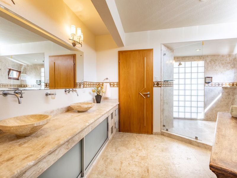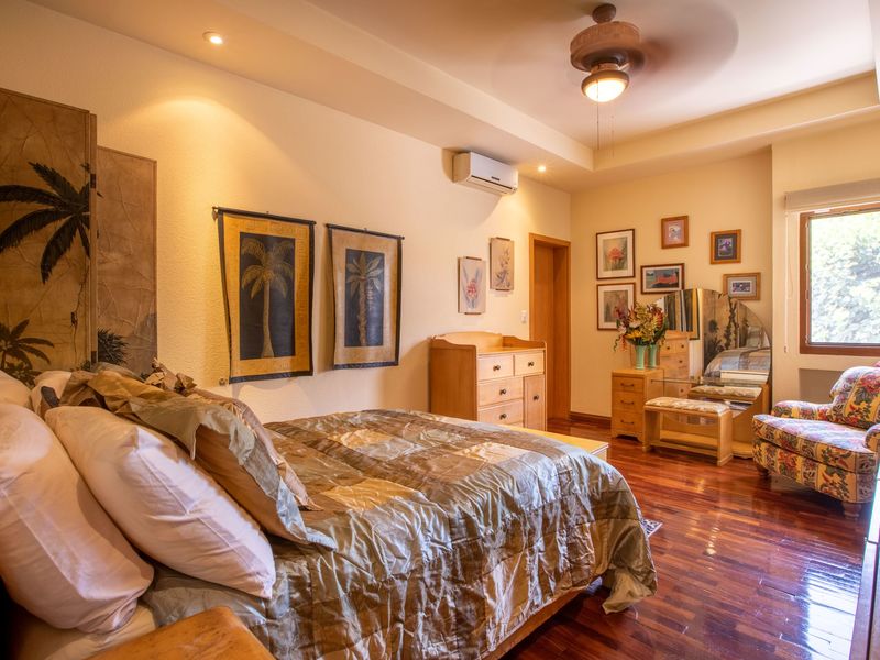 Upstairs you’ll find the family room with tropical wood floors and built-in cabinetry. The master suite is on one side with a balcony, an incredible walk-in closet with lots of drawers and space to organize your wardrobe, and a spacious bathroom with double sinks and a large shower. There are three other bedrooms; each with its own bathroom.