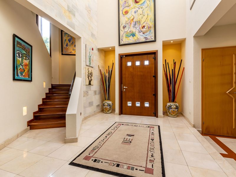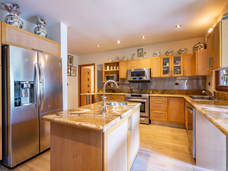 As you enter this elegant home you are greeted with a 2-story entrance, highlighted with a skylight, and the rest of the world disappears. To the side of the entrance, there is an area that could be an office, library, or music room. You’re drawn to the living area and the terrace beyond. The living room features full-length German doors, a wet bar, and beautiful teak floors. A step away is the formal dining room with lots of space to entertain your guests. The spacious kitchen is a delight with an abundance of Swiss cabinetry, new granite countertops, an island with a sink, a walk-in pantry, and a breakfast bar. All of these areas have access to the large covered terrace which opens onto the deck and solar heated pool, jacuzzi, and beautifully manicured gardens and enjoy the integrated sound system. Perfect for family living and entertaining.