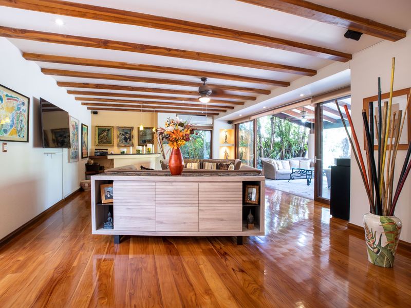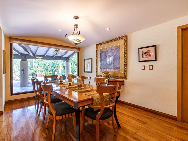 Al entrar en esta elegante casa se recibe con una entrada de doble altura, resaltada con un tragaluz, y el resto del mundo desaparece. A un lado de la entrada hay un area que podría ser una oficina, una biblioteca o una sala de música. Te sientes atraído por la sala principal y la terraza que hay más allá. La sala cuenta con puertas alemanas de gran longitud, un bar y hermosos pisos de teca. A un paso está el comedor formal con mucho espacio para entretener a sus invitados. La espaciosa cocina es una delicia con una abundancia de gabinetes suizos, nuevos sobres de granito, una isla con un fregadero, despensa grande y una barra desayunador. Todas estas áreas tienen acceso a la gran terraza cubierta que se abre a la piscina climatizada con energía solar, jacuzzi y jardines bellamente cuidados y disfrutar del sistema de sonido integrado. Perfecto para la vida familiar y el entretenimiento.