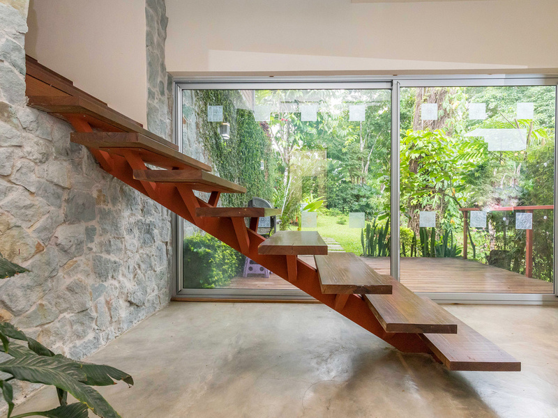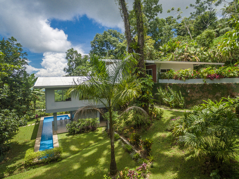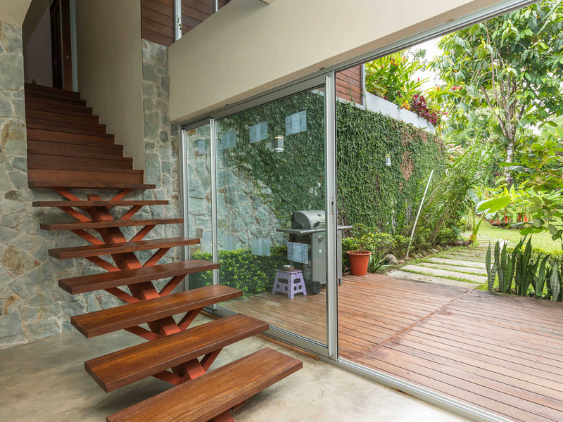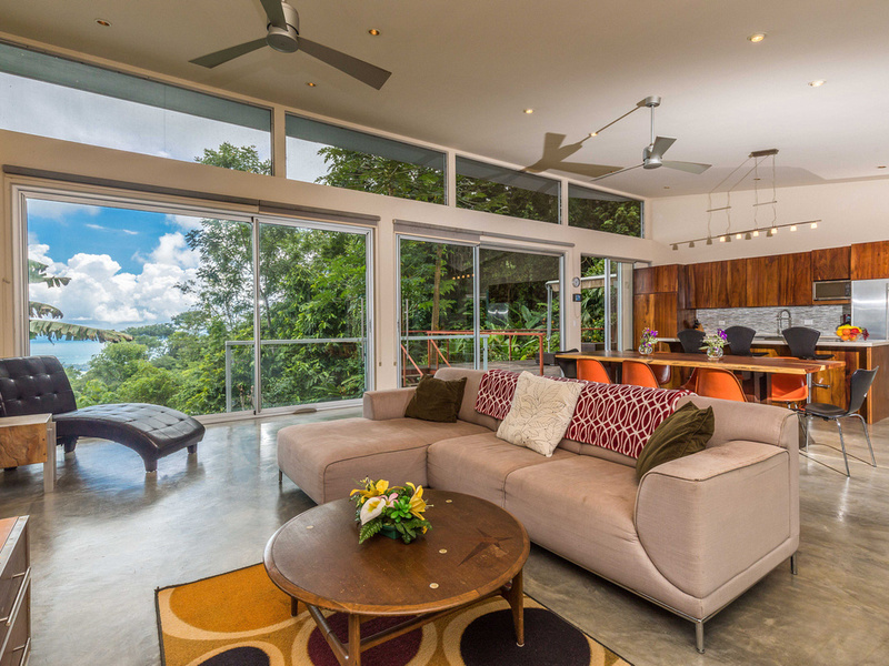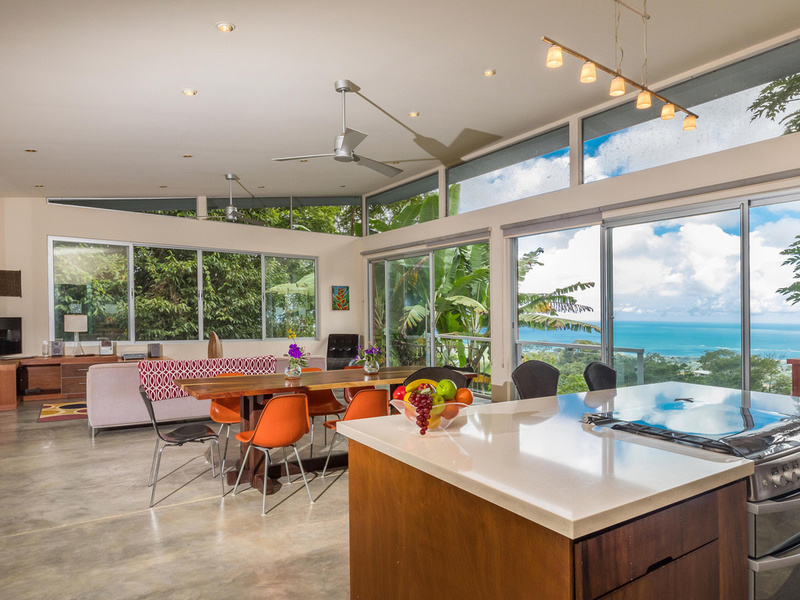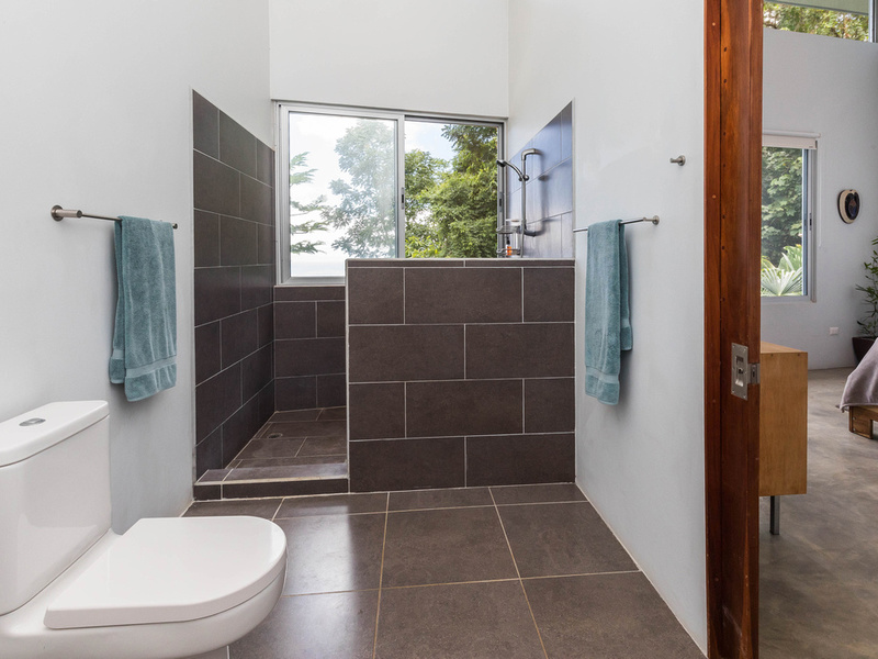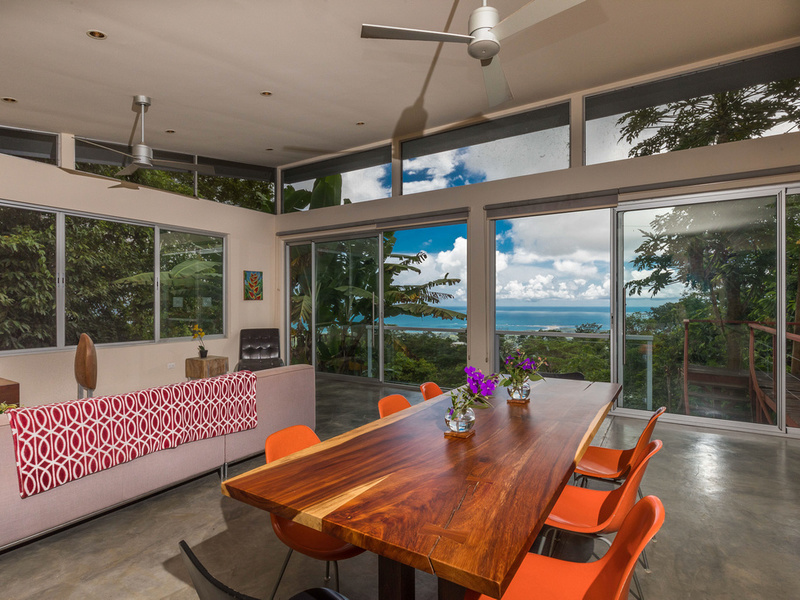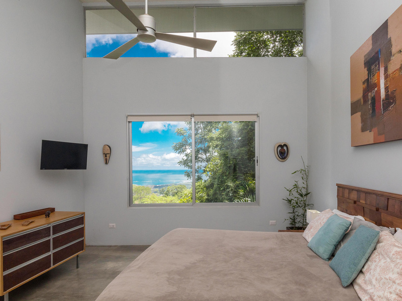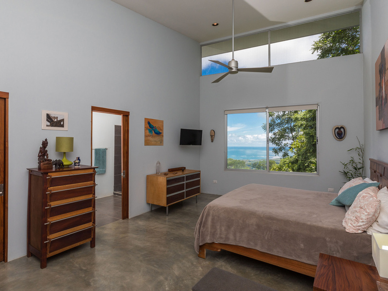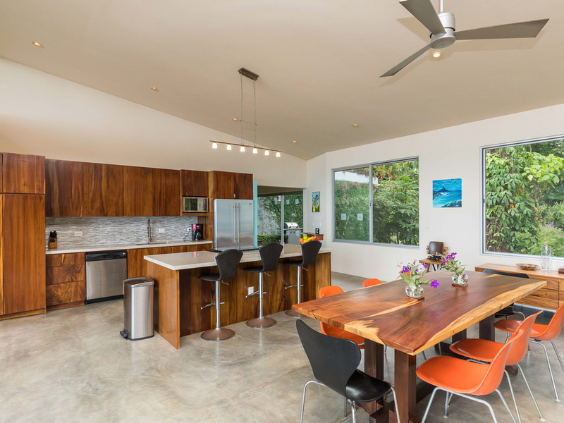 The graceful contemporary design, which was inspired by the architecture of Marcio Kogan, provides a wonderful juxtaposition and backdrop to the natural setting. The house is filled with custom-designed hand-crafted furniture. Costa Rican Guanacaste wood from a storm-felled tree provides richness and warmth contrasting against the polished concrete floors and the clean white Silestone and stainless steel surfaces. The heart of the home is an open-concept great room that incorporates the living, dining, and kitchen areas. This area has massive sliding glass doors that offer expansive views and can be opened up to maximize the breezes. This area is also ideal for entertaining and opens up to a newly installed recycled plastic decking material. On this level is also the 4th bedroom which has access to the deck.