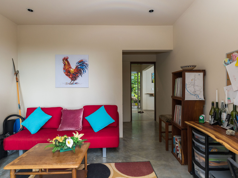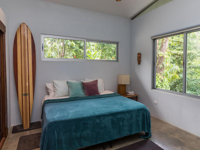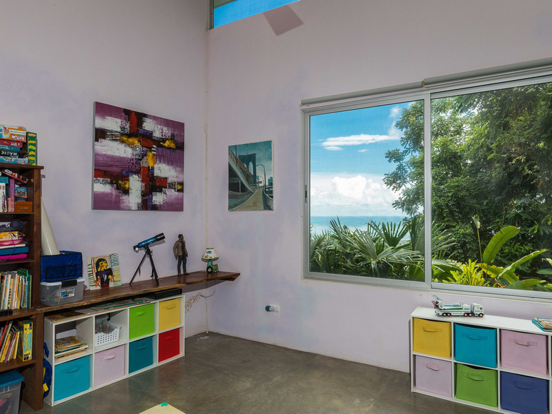 The main living space is linked to the second level by a floating staircase of metal and rich, dark guayacan wood (ironwood). Upstairs is the spacious master bedroom with en suite bathroom, a guest bedroom, and an even more spacious kids bedroom with two built-in bunk beds. There is also a shared full bathroom and a laundry/mudroom for the owners to enter. Outside of the mudroom is the covered two car parking area.