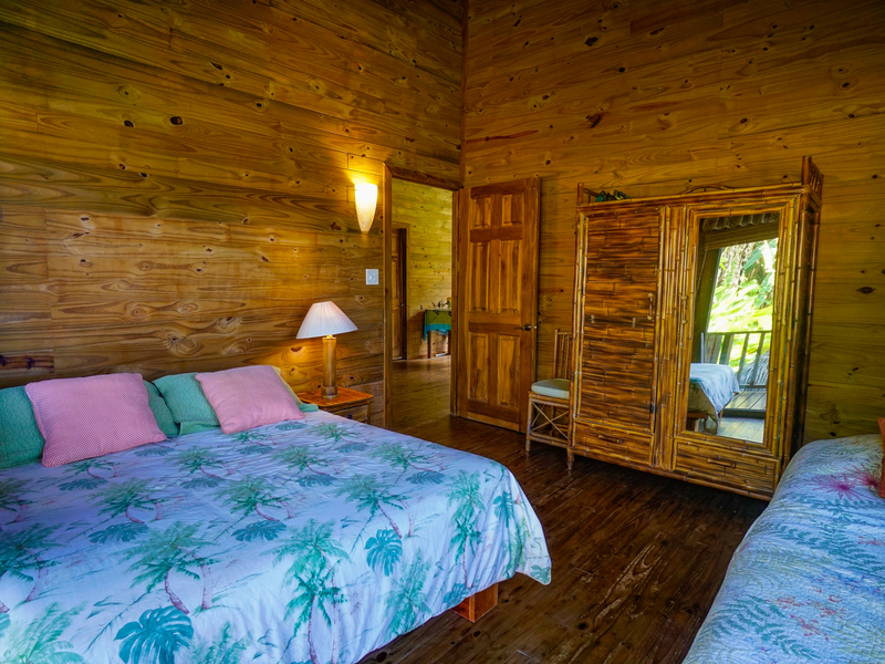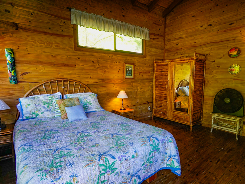 There is a 515 sq. ft. studio cabin (including the deck) is furnished with locally crafted bamboo furniture including a queen size bed with a pillow-top mattress and bamboo headboard, a kitchen table with 3 chairs, a settee, and arm chair in the sitting area, night stands, a bamboo wardrobe armoire, and 2 Adirondack deck chairs and loveseat.