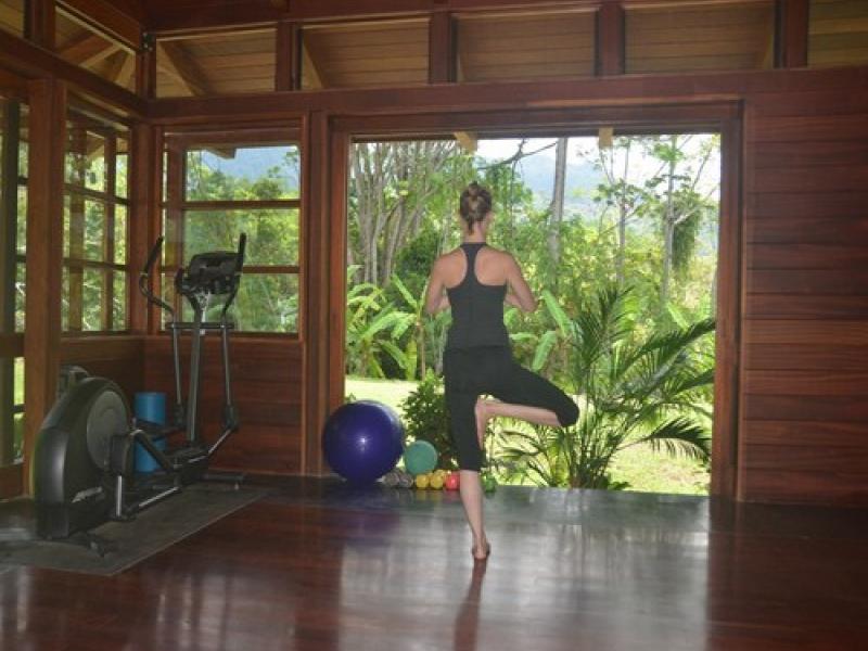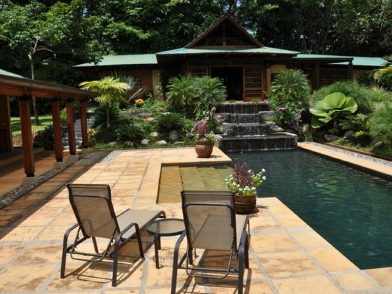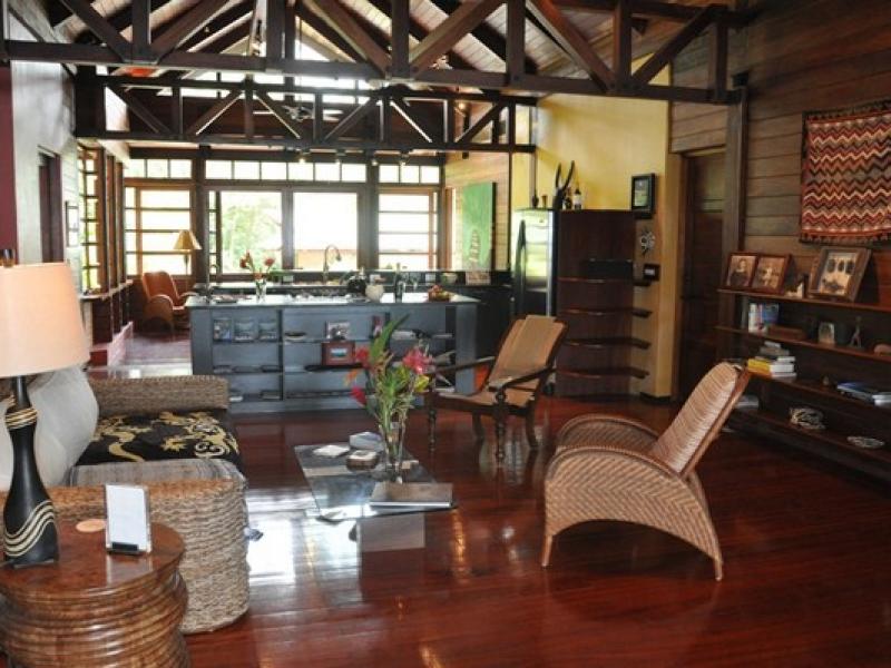 This is the essence of the perfect home in which the natural world is incorporated in every room of this architecturally exquisite home. Nestled below primary forest and completely surrounded by a 3,000+ acre single property with conservation easements and old plantations, the home is very private. Large numbers of toucans visit the property in the afternoons; howler and capuchin monkeys cavort in the trees regularly, scarlett macaws now live in the valley and whales can be spotted swimming in the Ballena National Park below. Architecturally the house is simply elegance, made entirely of fine local hardwoods, the house has a rich, lively feeling. It is described as a tree house, as a mountain home, and a beach house all in one. The house was completed in 2007 and was built of several types of the finest local hardwoods, including 32 8”x8”x8’ corteza columns, floors and ceilings of guapinol, and a 3,000 square foot deck of nispero chicle. In addition to staff housing, there are 3 buildings - the main house, the spa suite and the office/media room. There are 4 bedrooms each with their own bath, and a half bath off the main living. There is a modern kitchen with all the amenities and an outdoor grill. All the bedrooms access the natural world the house inhabits, with doors opening to decks and treetop canopies. The property offers lots of amenities for families and adults. Although it is private, it is a short drive to town, grocery stores, restaurants and beaches. Onsite, a lap length swimming pool with great depths for all size children, a full gourmet kitchen, media room and current exercise equipment are all offered.