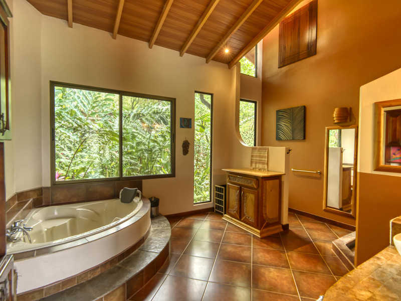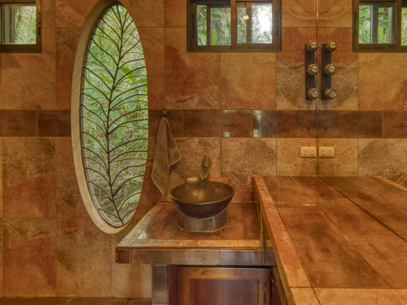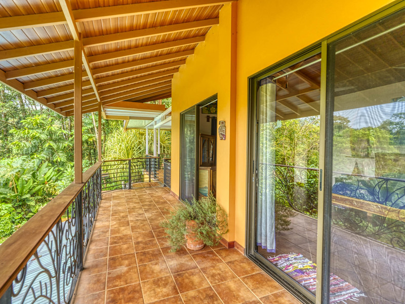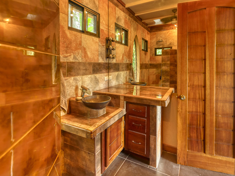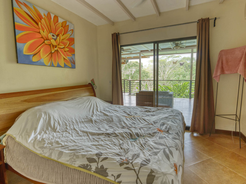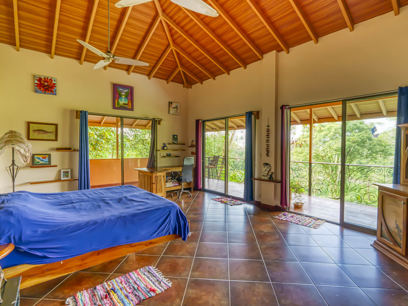Upstairs, there are three bedrooms. The spacious master suite includes a king size bed with a beautiful custom wooden frame, an armoire, and a wooden desk. The ensuite features a large soaking tub and large windows that give this room a garden feel. All of the bedrooms feature sweeping high ceilings and sliding door access to an upstairs deck. The covered wrap-around deck allows you to simply step outside your bedroom and sip your coffee while admiring the river and jungle view. There is another large covered patio area on the second floor. The exquisite iron work adds to the beauty of space. The main house has a third floor that has the possibility to be an additional deck space or could also be expanded to add more bedrooms or extra lounge space. This property is being offered with most of the furnishings’ that you will see when you tour the house.