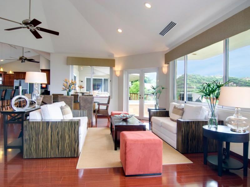THE PRICE WAS REDUCED FROM $990,000 TO $599,000 Exclusive villa nestled in the cliff side of Ocotal overlooking the Pacific Ocean. Two floors, separate structures with the master bedroom and one guest bedroom on the first structure level. Beautiful new wood floors, 5 bedrooms plus a caretakers apartment, 4.5 baths. Family/TV room. Cable/Satellite TV. High speed internet. Open floor plan. Spacious living/dining area. Gourmet Kitchen. Terrace with infinity pool and expansive ocean and mountain views. Garage and laundry room. A short drive to Playas Del Coco and all services and 20 minutes to the International Airport in Liberia.