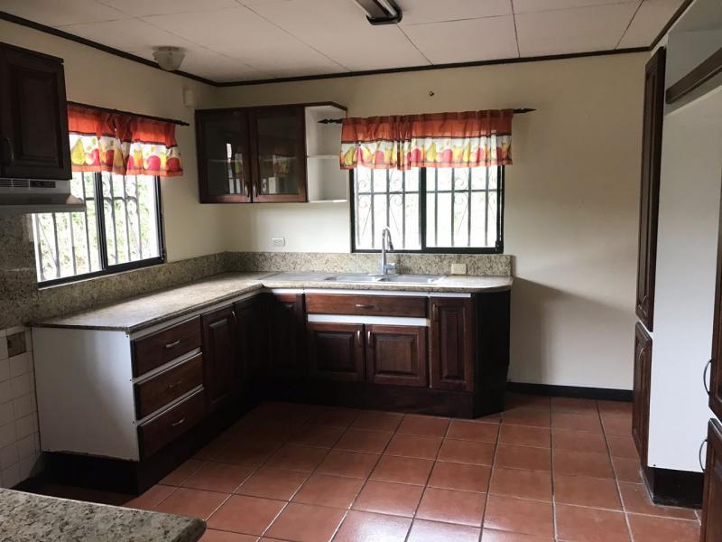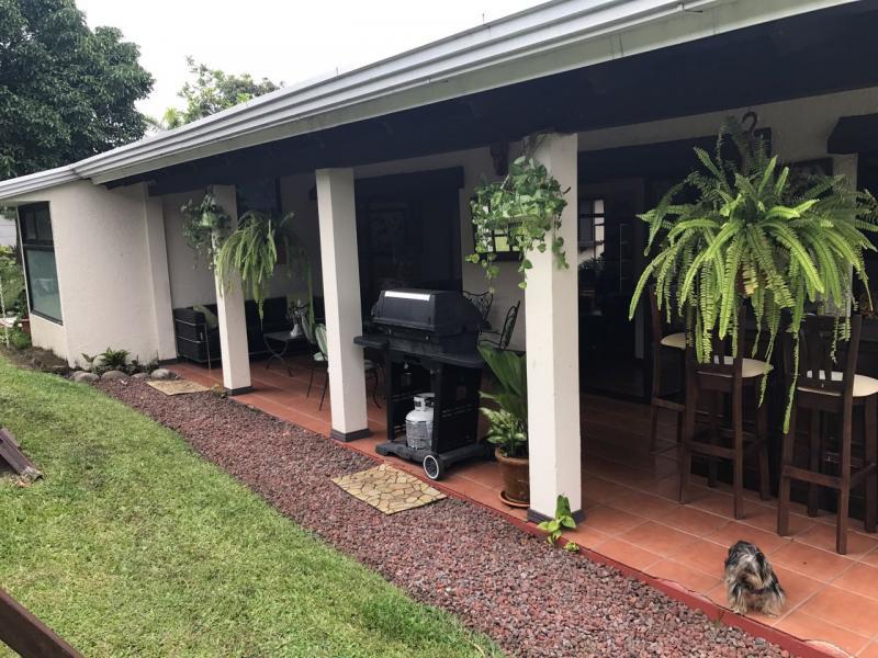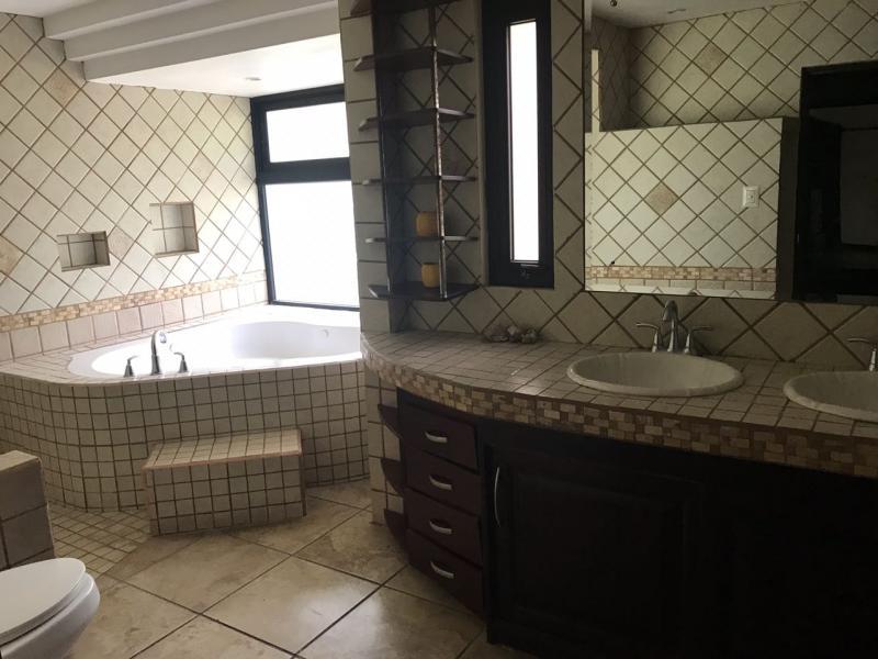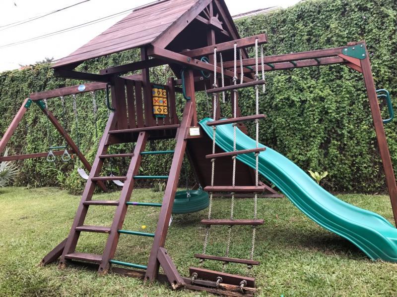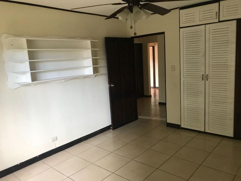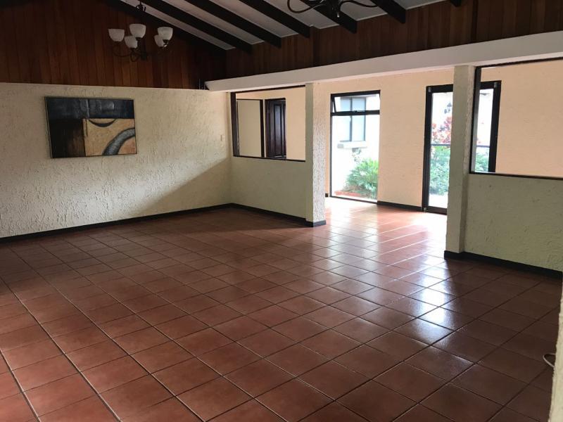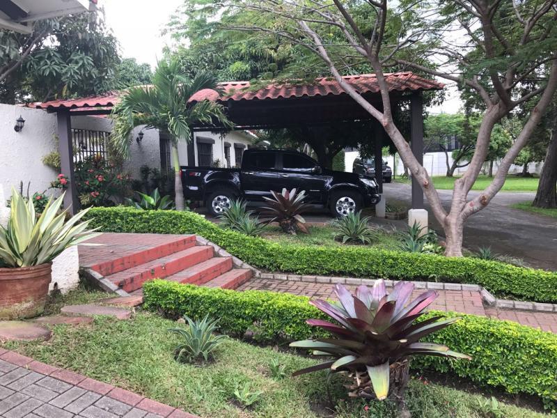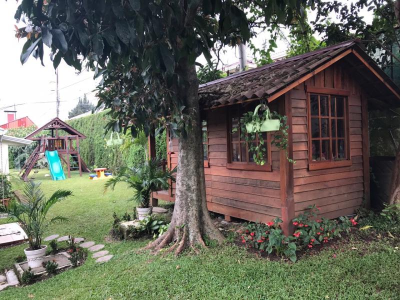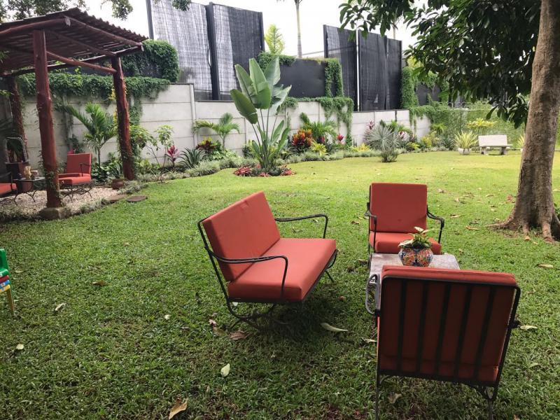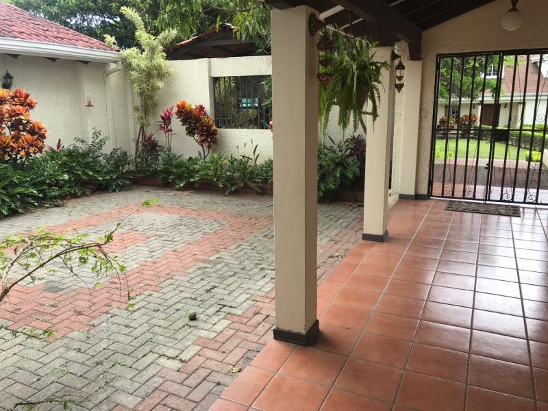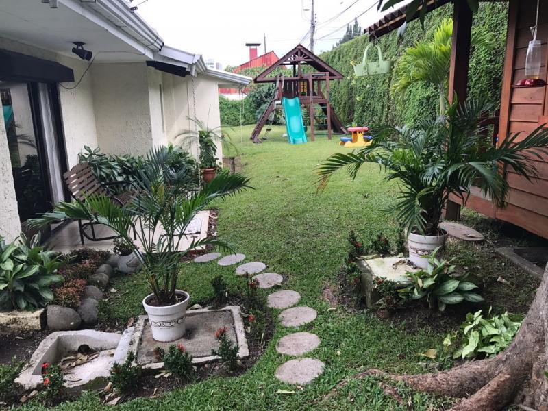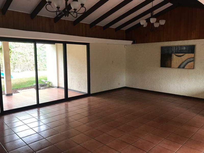 Casa de Una Planta Tipo Hacienda en Residencial Los Laureles en San Rafael de Escazu The house has a lobby, large internal garden, guest bathroom, large dining room with high coffered ceiling, independent kitchen, beautiful covered rear terrace, large gardens. Play area for children (play, trampoline and playhouse with beds and living room). 5 bedrooms, the main one with garden views, with double shower, Jacuzzi, double sink and walk-in closet, 4 secondary bedrooms with closet, 2 additional full bathrooms. Service room with full bathroom, laundry area, cellar. Covered garage for 4 vehicles and two more in open space. It has 24/7 security with controlled access, security fee 100,000 colones per month. It is also rented at $ 2,900 per month