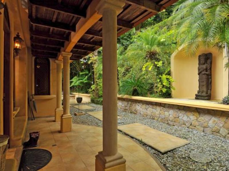 Pelican Bay luxury estate has two guest villas, caretaker house and garage, carport, entertainment deck and 8 parking spaces on 6.5 gated acres. Each villa has two bedrooms, two baths, kitchen, antique furnishings and unique art. Deck, infinity pool, hot tub, bar and gardens overlook ocean. Villas are constructed of concrete and stucco in Spanish Colonial style and decorated with Old World and Asian antiques and art. Custom tile floors with dark hardwood window trim give the villas a warm, welcoming feel. Fruit trees, flowers, and sculptures of Asian goddesses and animals fill the grounds. Jungle walkways lead to waterfall, meditation and picnic areas amidst teaming wildlife, creating balance and harmony with nature. Pelican Bay estate includes two additional building sites, one for a main house (several different building designs are available) and one for a guest villa. A new owner can complete the complex and enjoy income from vacation rentals, small boutique hotel or residential recovery center. This estate can't be beat for astounding beauty, luxury, income potential, and stunning Southern Pacific ocean views.