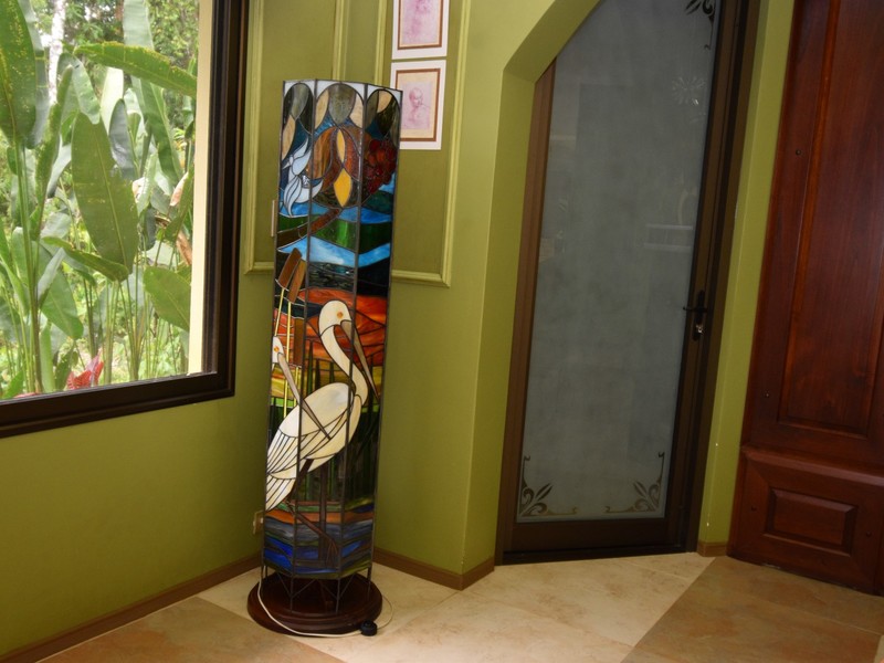 Finishing touches in natural wood and creative furnishings are everywhere in the home, including a special cabinet for bottles of beverages, a clay oven outside, and stained-glass accents created by the owner.