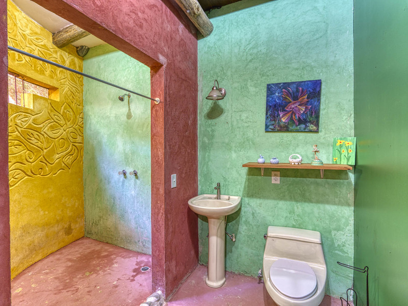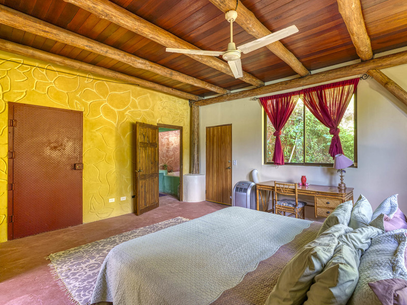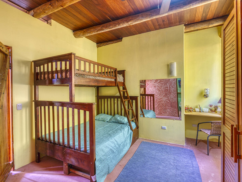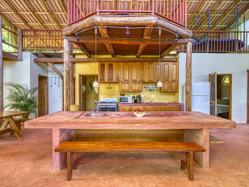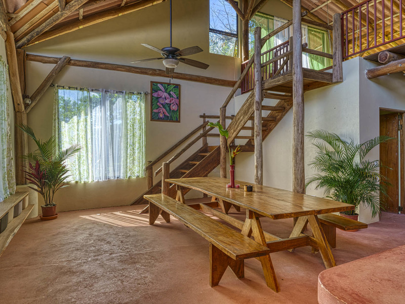 Both homes are sturdily sound and built legally with Teak, Ebony, Alizan wood from the property. The trees were handpicked for the house, and the owner logged and milled them himself. The 2x4 teak boards that were used for the framing of the house walls were once the owner’s wedding benches, making every piece of wood sentimental. All of the wood has been treated for bugs to prevent pest problems. Every beam has been bolted and anchored for earthquake safety. The open-concept kitchen and living room are gorgeous. The kitchen cabinets are constructed out of a local rose cedar. The dining room table was made from a single Alizan tree from the property. There is also a cement kitchen island with an extra sink on the side and bench seating on the other side. The wooden beams and pendant lighting complete the look. The living room and dining room feature large tempered glass windows. There are three bedrooms on the main level. The Master suite features a king-size bed and a large walk-in owner's closet. Inside the master bath, you’ll find the cement walls that are finished with an Italian Ocre finish and carved by the owner who is a professional artist. The shower is in the shape of a shell with an adjustable handheld shower. There is also a large soaking tub. This bathroom gives a luxurious and artsy vibe. The other two bedrooms include bunk beds in one room and a twin bed in another, making this a family-friendly home.