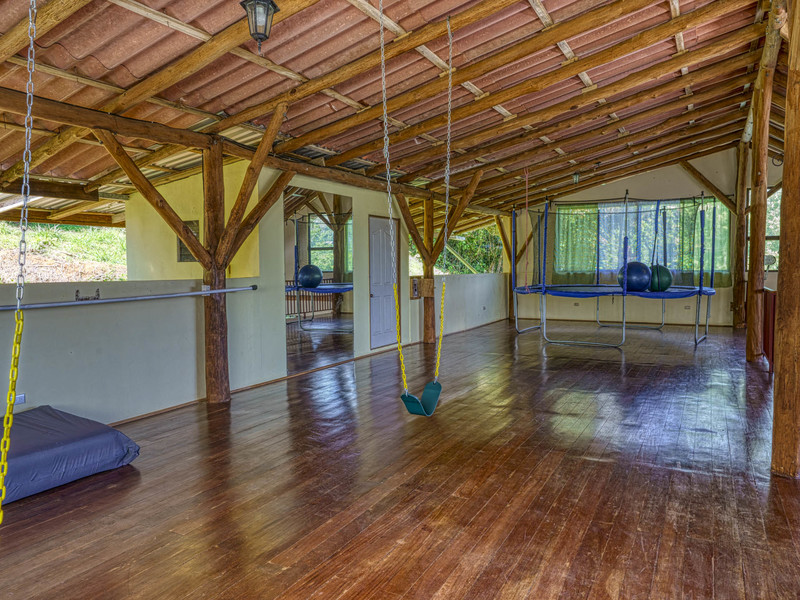The upstairs had been used as a ballet studio for years, and world-famous ballerinas and ballet masters danced there. The giant window shutter on that level allowed for open-air access and stunning views while practicing ballet. The ballet barre is still up, but the upstairs has been converted to a family fun area with a trampoline, swings, and mats. In the corner, there is a wooden table and chairs, giving you access to the abundant jungle of trees The detached house offers some lovely furnishings too. The kitchen includes many of the same kitchen cabinets but a much smaller eat-in table. On the wrap-around porch, there are some wooden rockers and a wooden table to enjoy the fresh air and scenery. The large bedroom includes one king bed and two additional beds, while the smaller bedroom features a day bed.