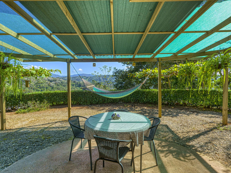 The outside area is lovely with a patio table and chairs, a hammock to relax in, and an above-ground round swimming pool. Fruit trees surround the houses and property and were planted when the house was built and are now starting to bear fruit. You’ll have an abundance of wildlife on the property, including exotic wild birds and some sloth families. Some of them, named Amable and Lucy have lived there for years.