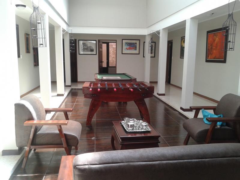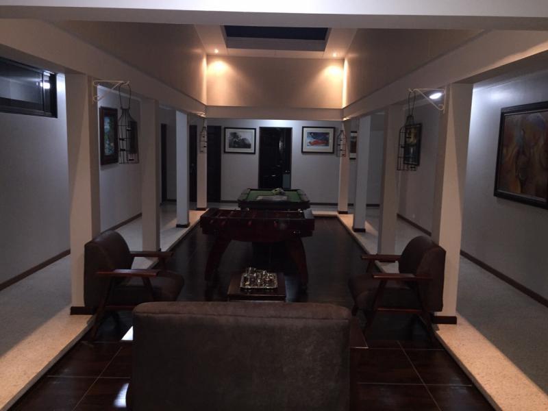 Espaciosa Casa de Una Planta con Bellos Acabados en Rohrmoser. It consists of a Plant with an area of 380 m2. Lots of lighting and ventilation Spacious Visiting Room, and a Family Room Formal dining room Internal Gardens. BBQ area, with kitchen and patio. Light-swallower. Pool games room. Full kitchen with breakfast bar, built in granite and with its cupboard furniture. 4 rooms with closet and one for office or study also with bathroom. 2 full baths. 50 Gallon Water Tank ,. Client Water System throughout the House. Complete Service Area. Attic, Warehouse, Battery Room and Machine Room. Monitoring System 24 hours. Located very close to the Rohrmoser Police. Closed garage for two vehicles with remote control and another space for a vehicle without a roof.