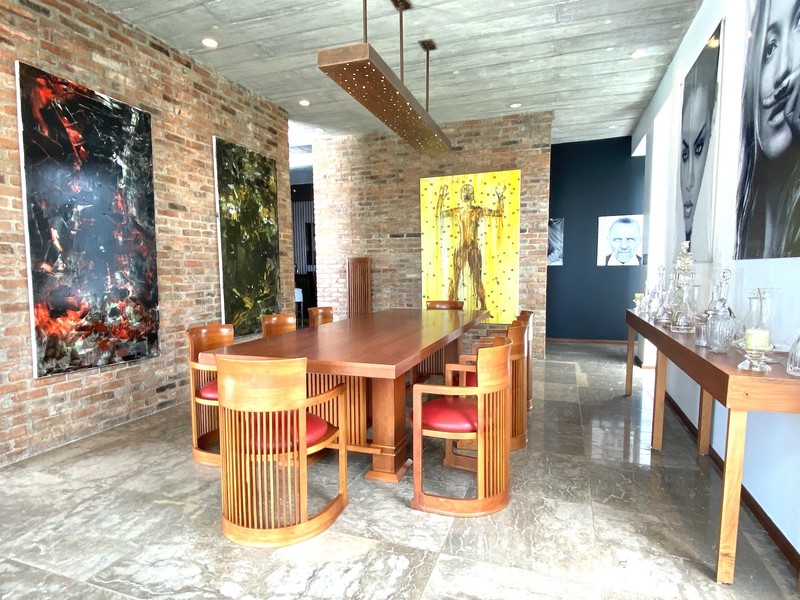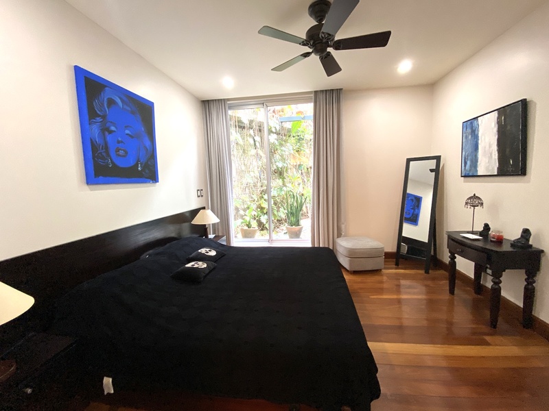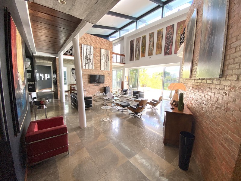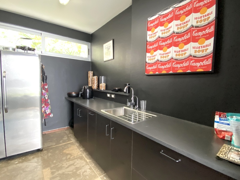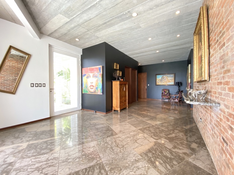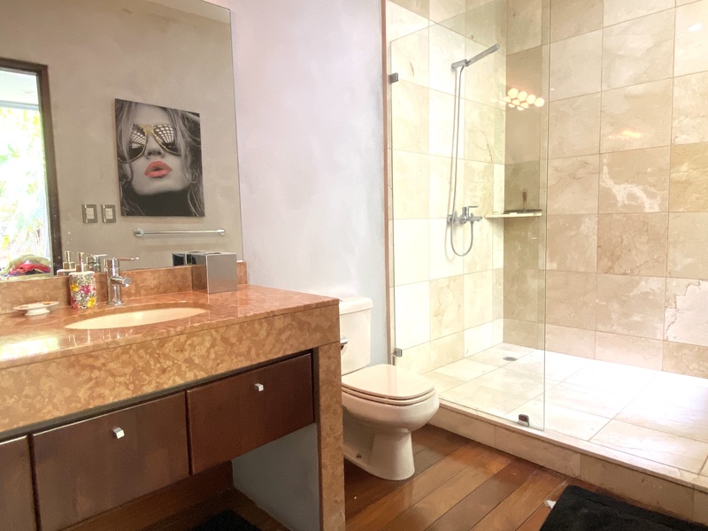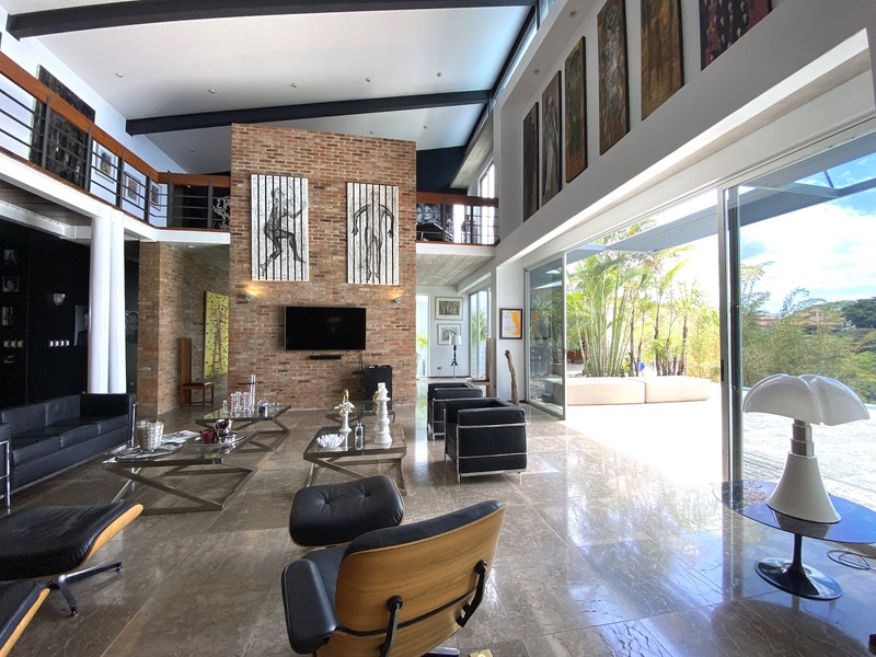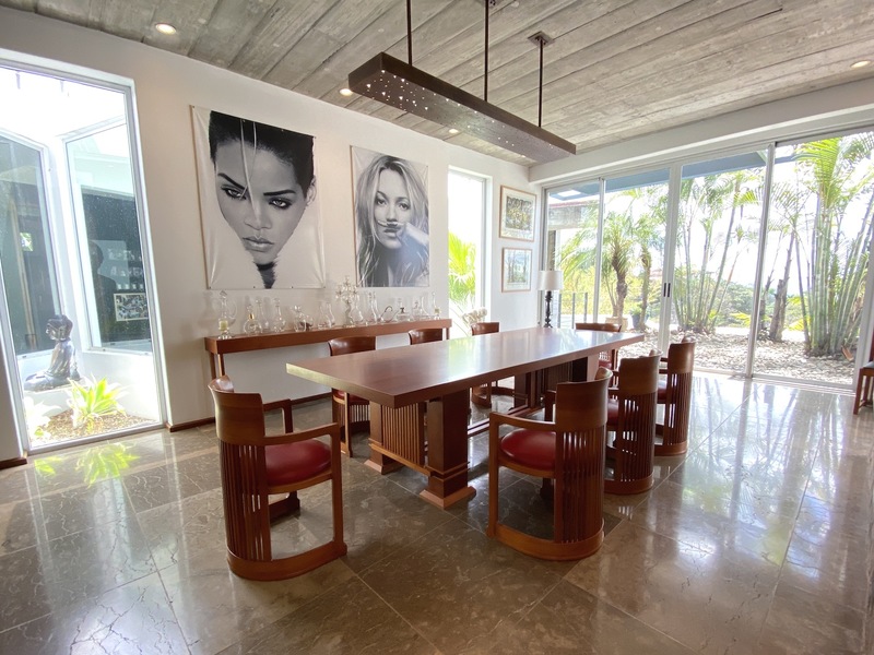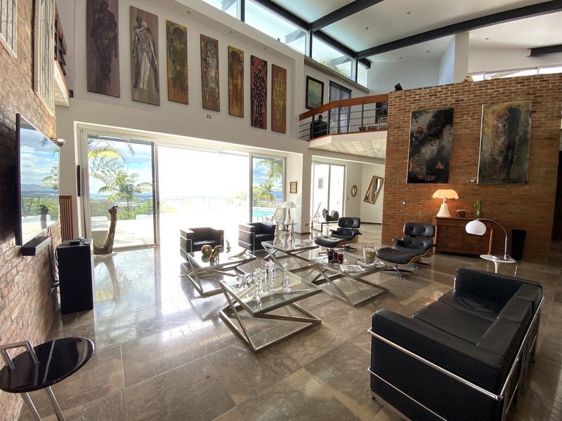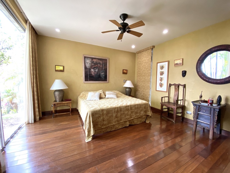 The 12,648 square feet (1,175 m2) 3-story house, each level connected by an elevator, has a formal entryway. The spacious, double-height, living room with an integrated bar, South American stone floors, and a brick feature wall open onto a large coralline terrace and the solar heated, infinity lap pool where you’ll enjoy the valley views and sunset views over the Gulf of Nicoya. The formal dining room also has access to the terrace and pool. The modern kitchen features stainless steel appliances, a central island, granite countertops, a prep kitchen with a large pantry, and access to a covered terrace that is adjacent to the pool area for informal dining and entertaining. There are also 2 bedrooms with their own bathrooms on this floor.