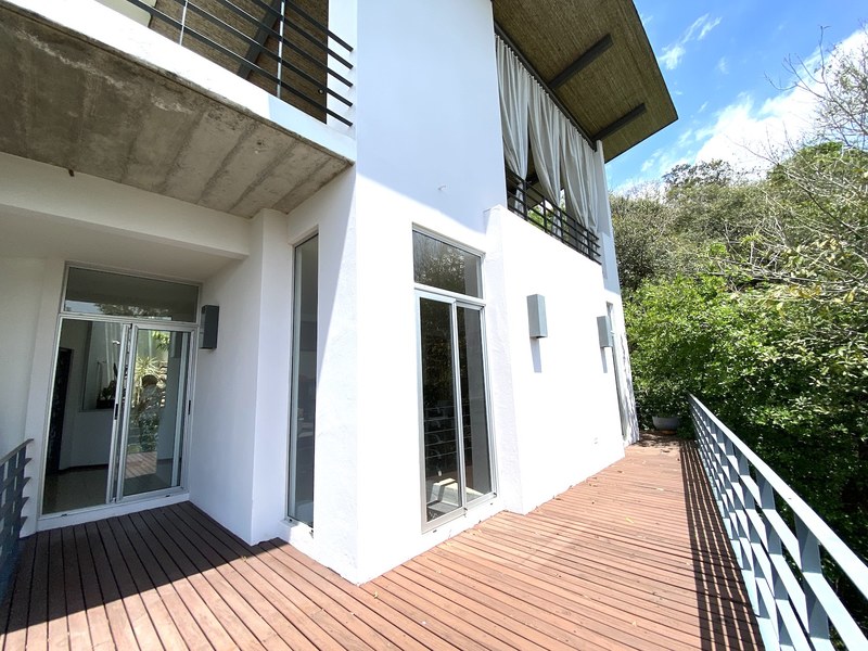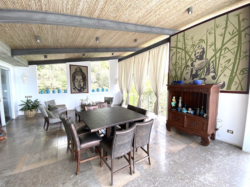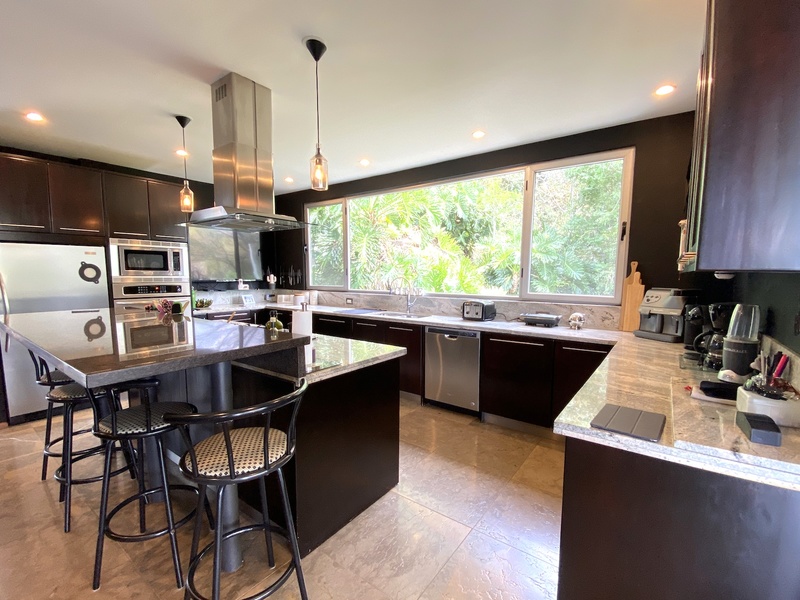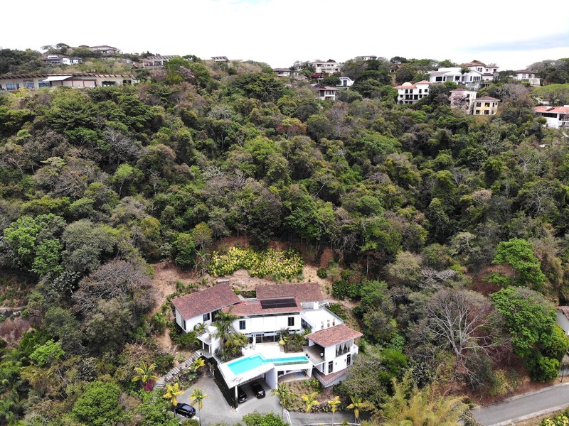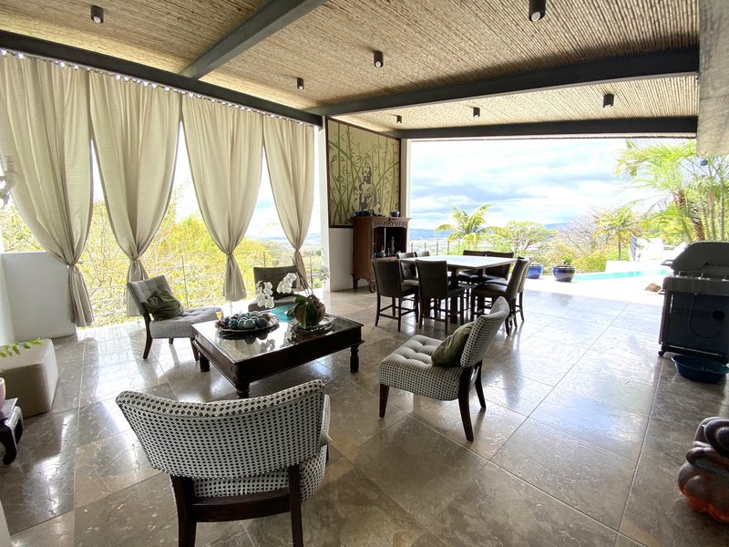 La casa de 1,175 m2 (12,648 pies cuadrados) de tres plantas, cada una de ellas conectada por un ascensor, tiene una entrada formal. El espacioso salón de doble altura, con un bar integrado, suelos de piedra peruana y una pared de ladrillo, se abre a una gran terraza de coralina y a la piscina infinita climatizada por energía solar, donde podrá disfrutar de las vistas del valle y de la puesta de sol sobre el Golfo de Nicoya. El comedor formal también tiene acceso a la terraza y la piscina. La moderna cocina cuenta con electrodomésticos de acero inoxidable, una isla central, encimeras de granito, una cocina de preparación y una gran despensa y el acceso a una terraza cubierta que se encuentra junto a la zona de la piscina para la cena informal y de entretenimiento. También hay 2 dormitorios con sus propios baños en esta planta.