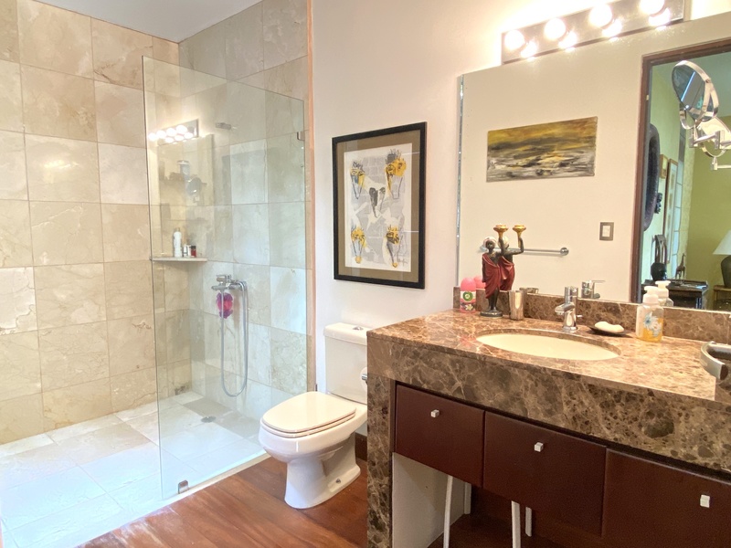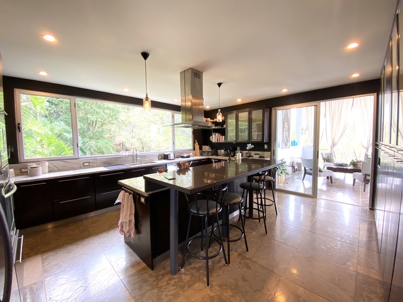 On the 3rd level of this exquisite home, there is an office area with vaulted ceilings that overlooks the living room below, a family room, and 3 bedrooms; each with its own bathroom. The master bedroom suite features air conditioning, 2 walk-in closets, a bathroom with marble countertops and bathtub and shower, and a very large rooftop terrace to enjoy the views and nature.