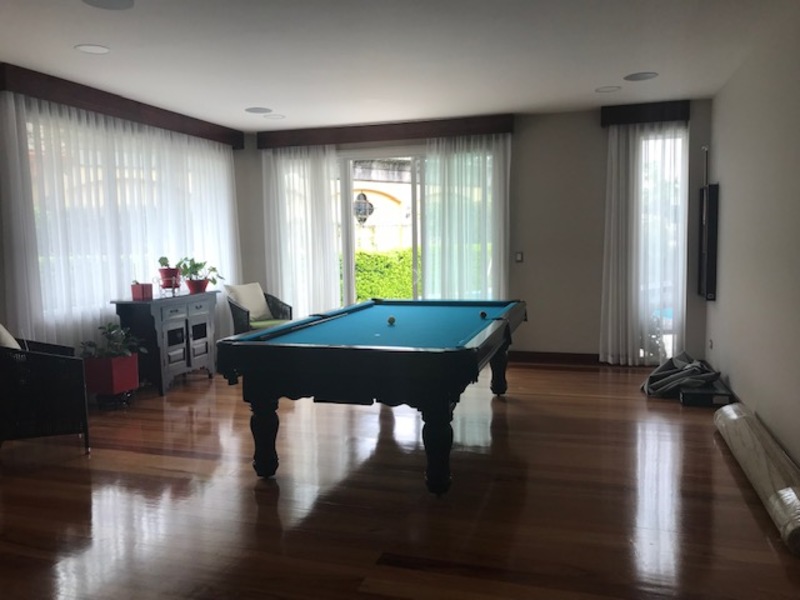 Home theater with 8 reclining armchairs, with stereo sound and air conditioning, ideal game room for pool table, wine cellar, separate office with wooden shelves.