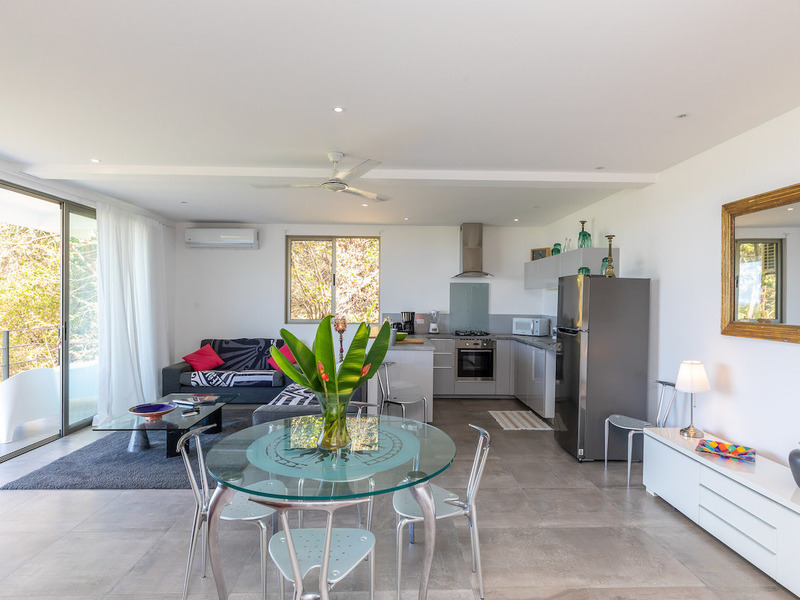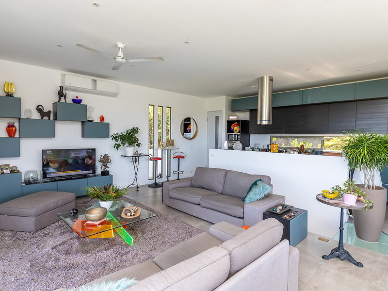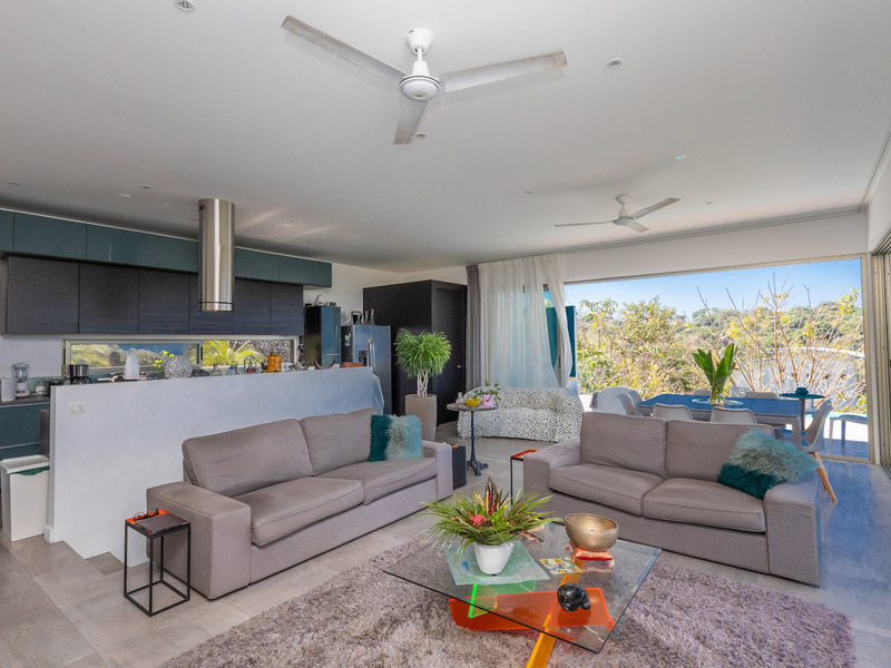 Open concept kitchen, living room and dinning room are met by a ocean and jungle view with the upper swimming pool. The kitchen is state of art, with high-end cabinetry, and a stove facing the sea, creating a chef’s dream. The living room area with flat screen TV, allows you to remain connected poolside. The high end sliding glass doors slide, open to where you feel like you have no walls at all. Allowing the magical Pacific Ocean breeze in.