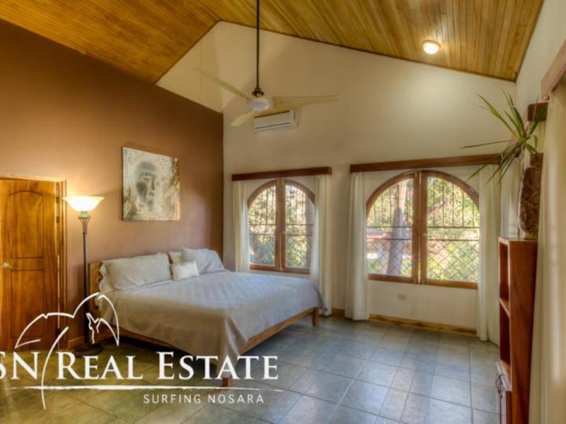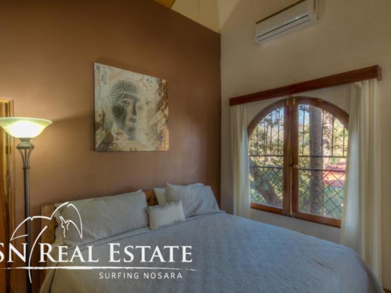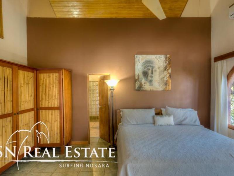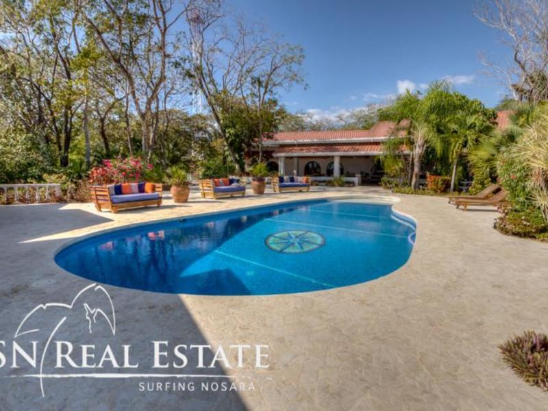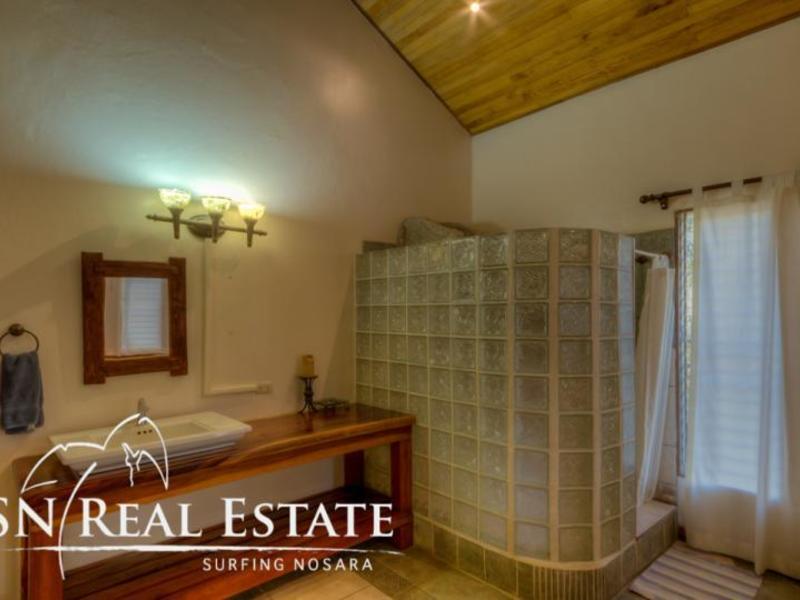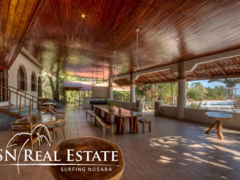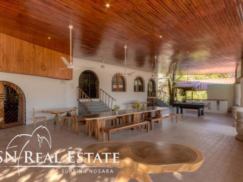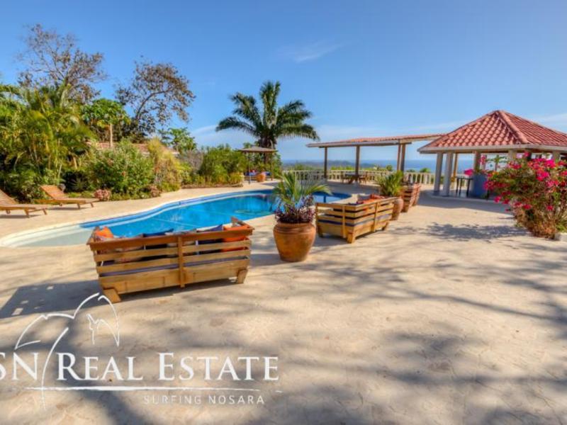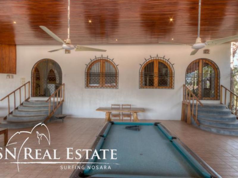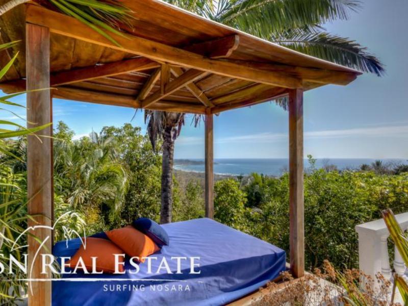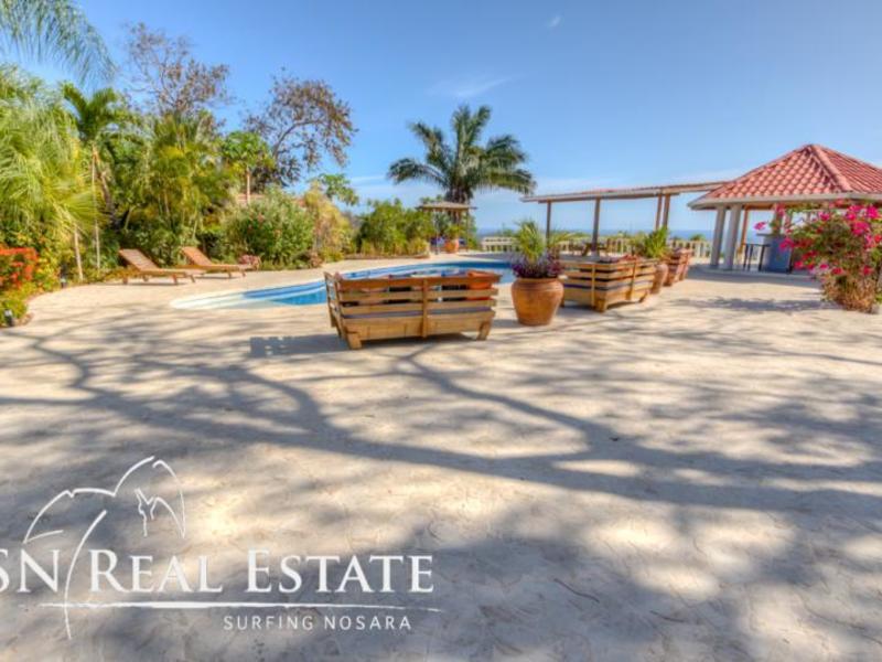 Sunset Peak is an amazing property that allows families and groups to have privacy and seclusion with easy access to Nosara beaches. Overlooking the main beach of Playa Guiones, start and end your day with a breathtaking 180 degree ocean view. The 1.25-acre property consists of a large main house and a second living area with two bedrooms - Sunset Peak sleeps up to 15 people. The main house has four bedrooms and a total of five beds and two bathrooms. The second living area features two bedrooms and each have a queen bed, futon, and a private bathroom. There are also two outdoor bathrooms alongside the exceptionally large pool. There is a large covered rancho connected to the main house with a bar, pool table and large dining table. Enjoy a beverage at the outside pool bar that overlooks the jungle and beach. Feel free to roam the grounds, along the beautiful pathways lined with different varieties of fruit trees.