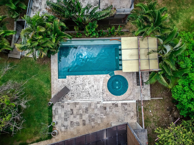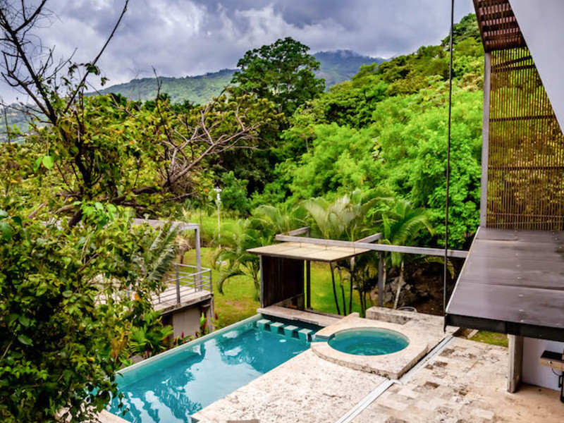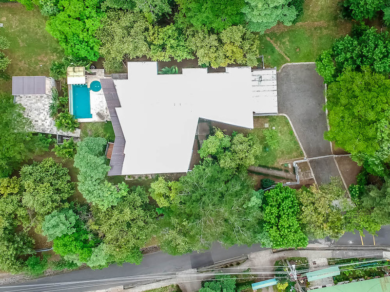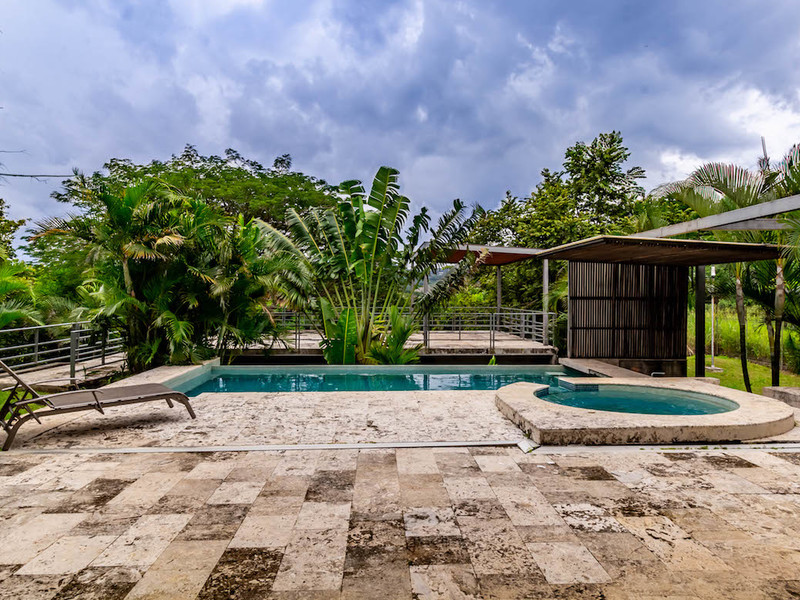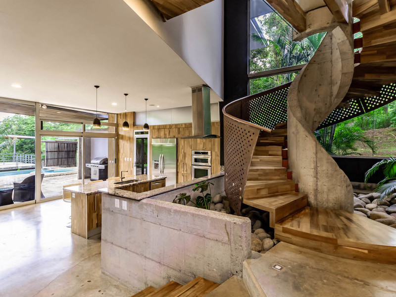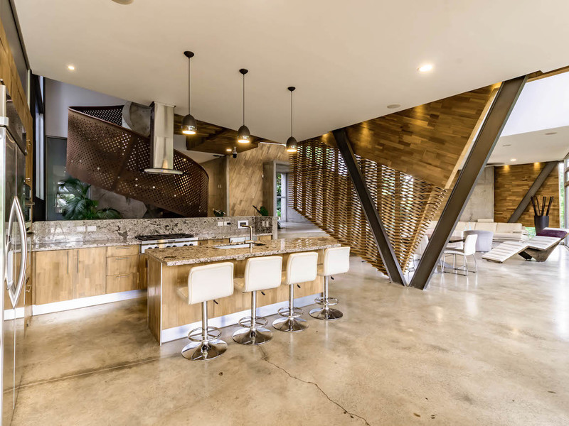 This spacious, 8,148 square foot (757 m2), contemporary house is in Rio Oro Santa Ana, close to shops, restaurants and office parks. The almost one-acre (3,850 m2) property offers privacy and mountain views. The house was designed to harmoniously blend the natural surroundings with the home itself, using lots of natural light, tropical woods, metal, natural stone and concrete finishes.