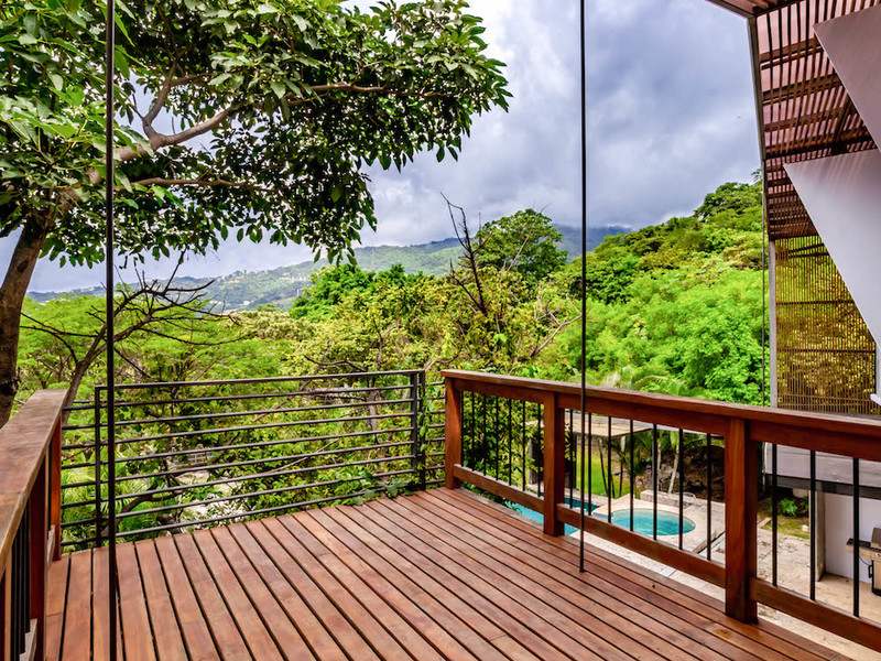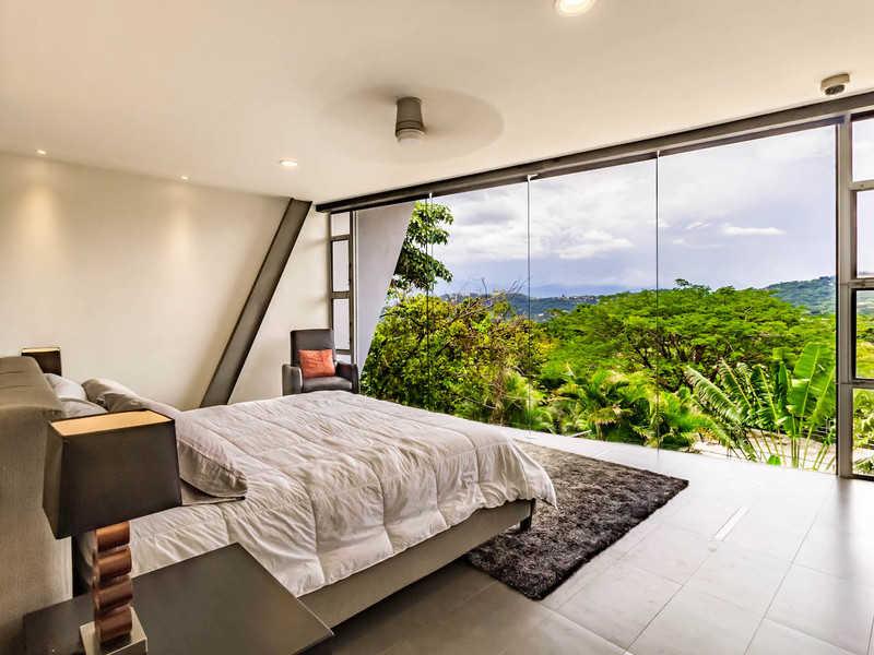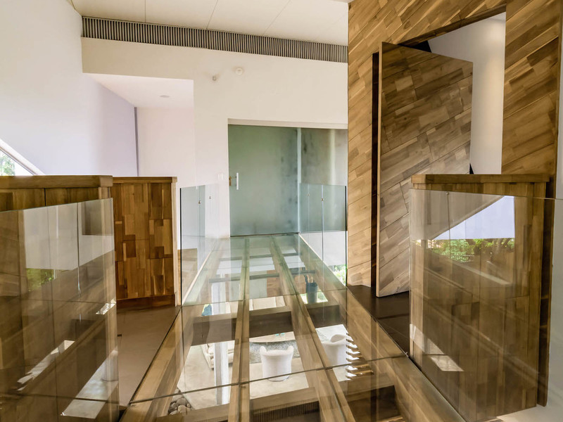 El segundo nivel de la casa tiene un puente de vidrio templado que conecta las dos suites principales con ventanas de piso a techo, persianas con control remoto y vistas a la montaña. En el otro lado de la segunda planta hay una gran sala de estar y dos dormitorios más, cada uno con su propio baño. Todas las habitaciones tienen aire acondicionado.