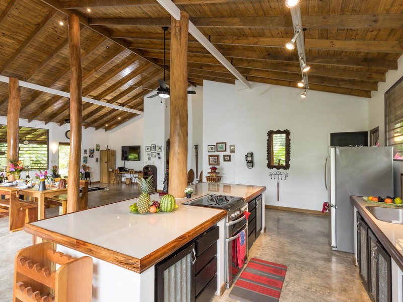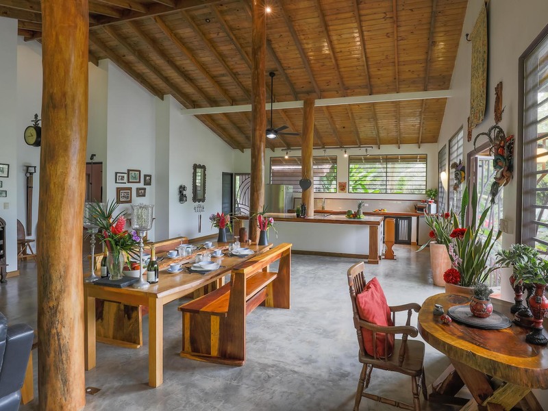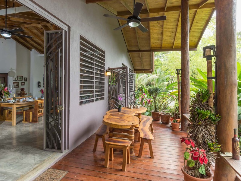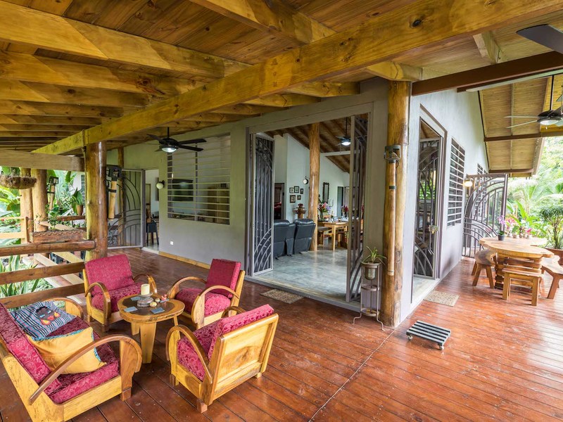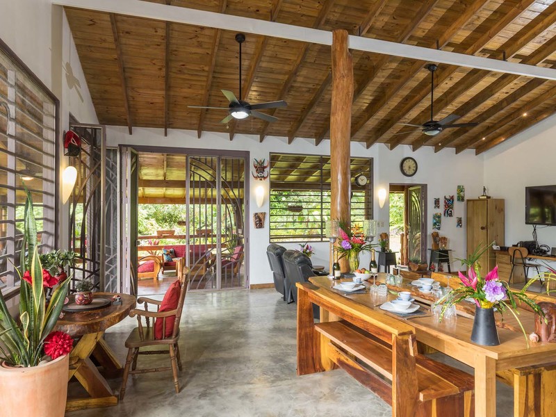 Expertly built to a high standard in 2012 the property comprises of 2 bedrooms, 2 Bathrooms, a fully fitted kitchen, porcelain kitchen counter tops, hand made Guanacaste kitchen cabinets, polished concrete floors a large pantry, extremely spacious dining and entertainment area, perfect for large functions or a restaurant for entertaining guests. The property has a 350 square foot wrap around raised balcony which could easily double up as a wonderful cafe, overlooking the delightful Morete river plus outstanding jungle views. Amenities cable internet, phone and TV, Chrome kitchen fittings, ceiling fans, ac connections both bedrooms. Attached to the main residence is a covered parking area and a bodega with laundry facilities and storage areas applicable to a busy business.