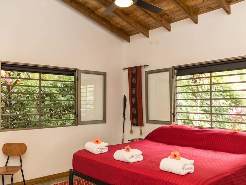 A cultivated well manicured tropical garden landscaped with an abundance of plants. The gravel garden paths lined with granite river rocks lead you around this beautifully well maintained mature garden. You are able to relax and overlook the surroundings from your outdoor bedded area, or cook a meal in the sheltered BBQ area. The property has mature Banana trees, papaya, cacao, limes, mamonchinos almond and various tropical plants that have been stylistically positioned to make this garden a very private relaxing and interesting place to spend that well earned holiday.