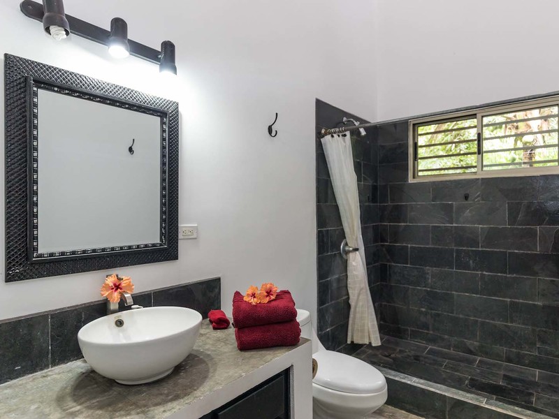 Situated close to all the Casitas it has been expertly been designed by a local architect utilising imported Bali green stone tiles and natural rocks allowing the area to seem to naturally fit into the surroundings also adding that high class touch, to make the pool stand out from the rest. Attached to the pool is a solid built stone entertaining area with ceiling fans and lights it is built in the style of a folly encompassing granite rocks and having hand-made Guanacaste wooden features throughout. The roof is a solid built construction with clay tiles. The pool also has an outdoor shower which again looks out into the landscaped gardens and river area. No expense has been spared on this quality area.