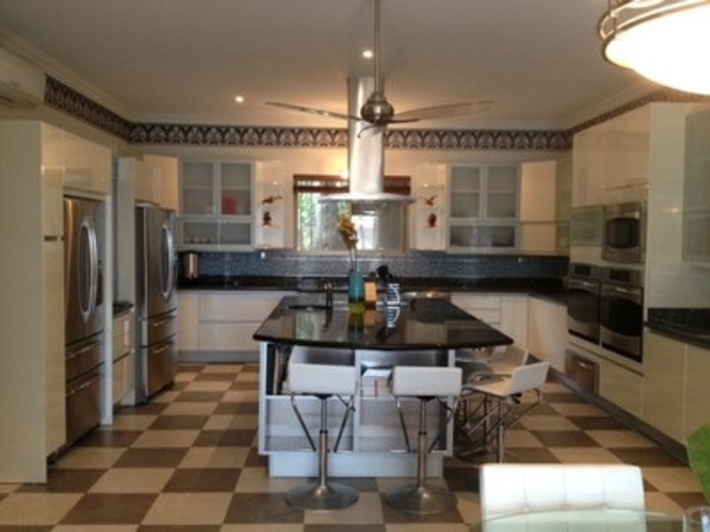 The kitchen is state-of-the-art with all stainless steel appliances, including a matched set of double door refrigerators, 2 wall ovens, a built-in microwave, an electric stove top and a dishwasher, surrounded by granite counter tops.