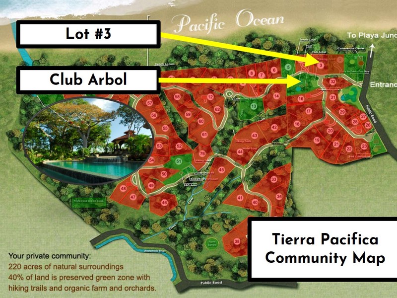Welcome to lot #3 in Tierra Pacifica, an exceptional gated ecological community in Playa Junquillal, Guanacaste Costa Rica. The lot is located just footsteps, literally just across the road, from Tierra Pacifica's gorgeous community facilities, called Club Arbol, and a nearby supermarket.