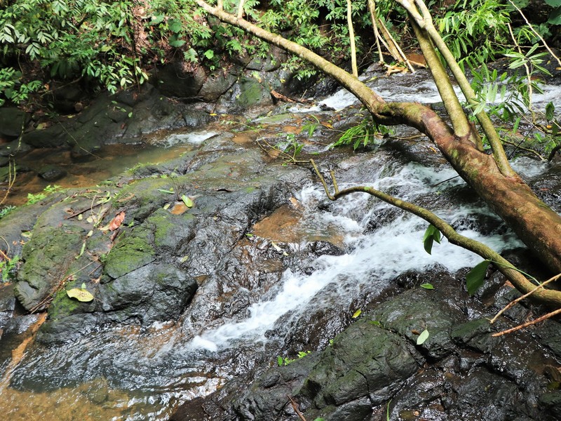 Towering, possibly primary-forest trees, line the pathway that has been prepared which leads down a gentle switch-back trail to the riverbank and waterfall pools.