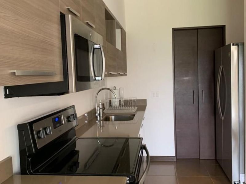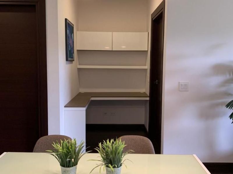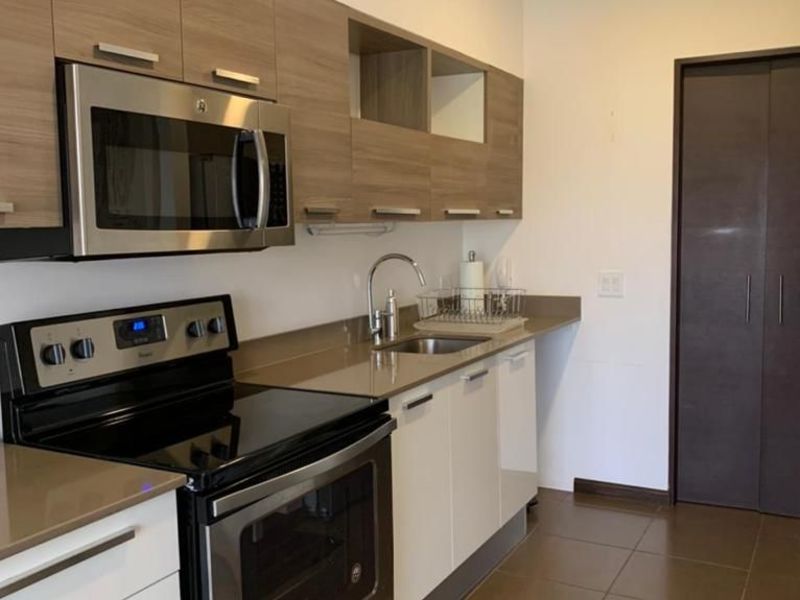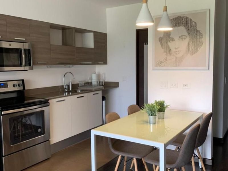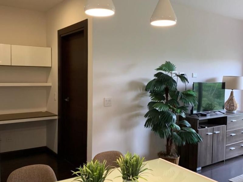 Fully furnished apartment for rent in Abito Bosque Urbano One bedroom with king-sized bed and one bathroom with walk-in closet. Monthly rent is $950, including maintenance. Apartment comes with appliances (refrigirator, microwave, electric stove, oven and washer-dryer) The living room has a sofa, TV bench and TV. The kitchen comes fullystocked with plates, glasses, wine glasses and kitchen accesories. It has a dining room, office, laundry room and a balcony with mountain views. The apartment complex has a BBQ área, a gym a fire pit, a yoga área, a semi-olimpic pool and hiking trails and is also pet friendly.