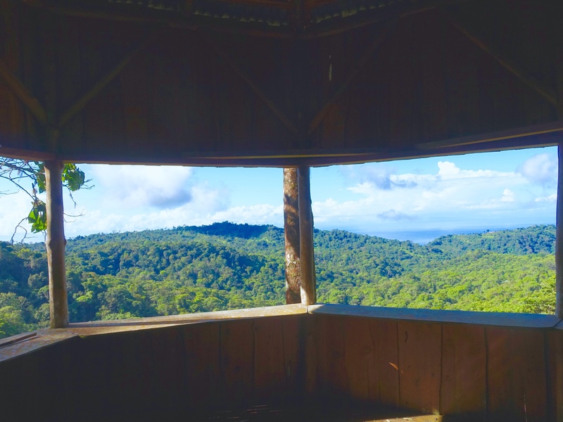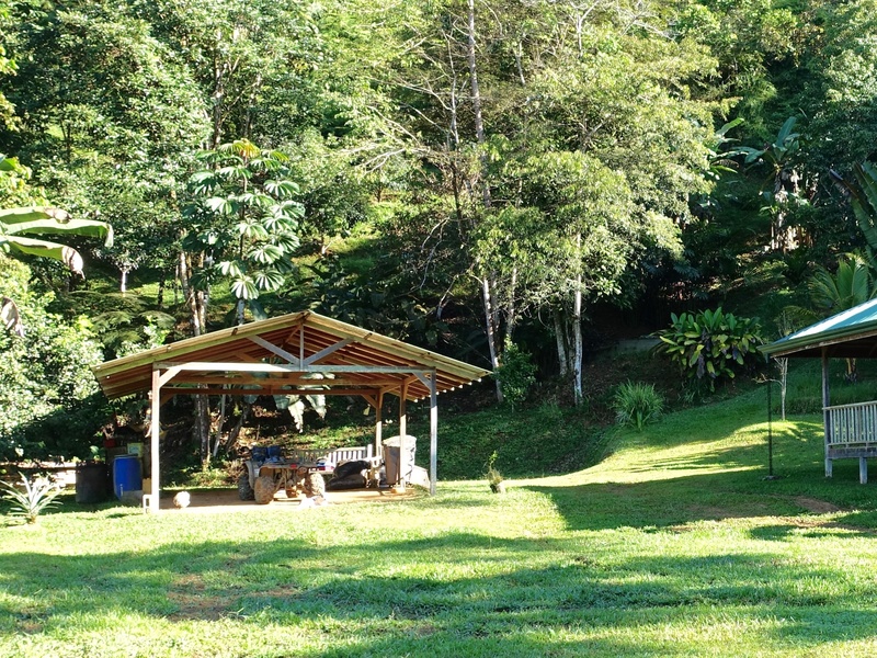 Approximately 20 acres of mixed forest and open land with amazing ocean views, over 200 different fruit trees, internal road access, multiple building sites, a tilapia pond, waterfalls, chicken coop, well-built garage, and gorgeous custom built home with precious hardwoods!