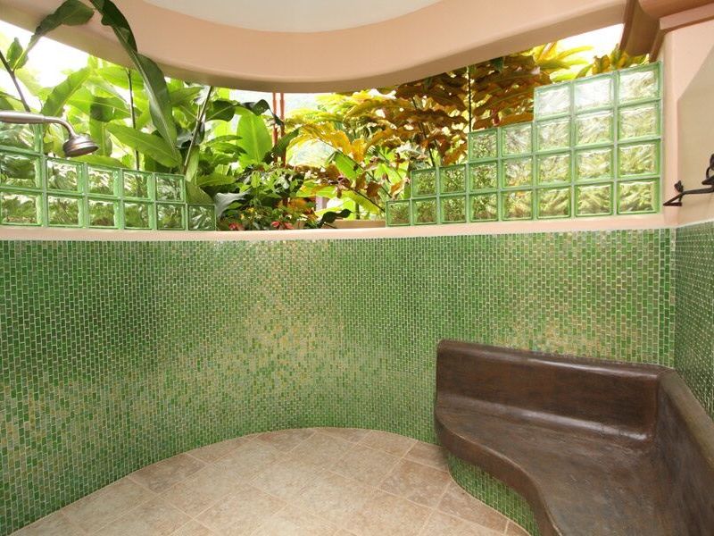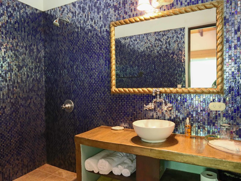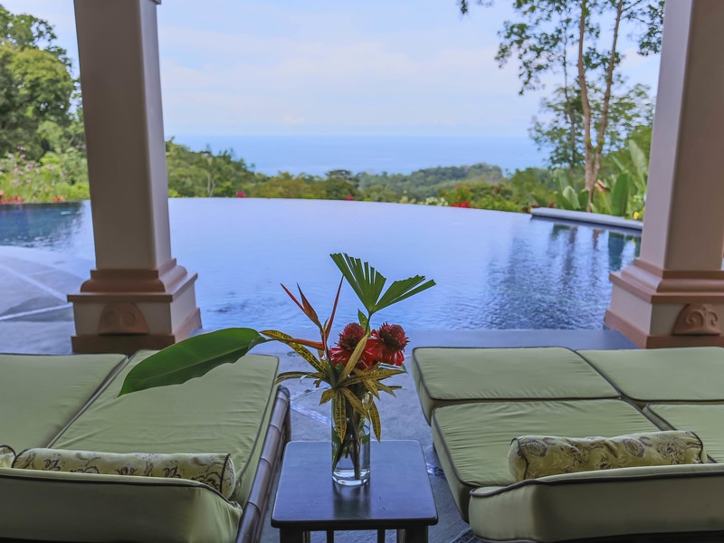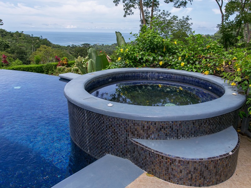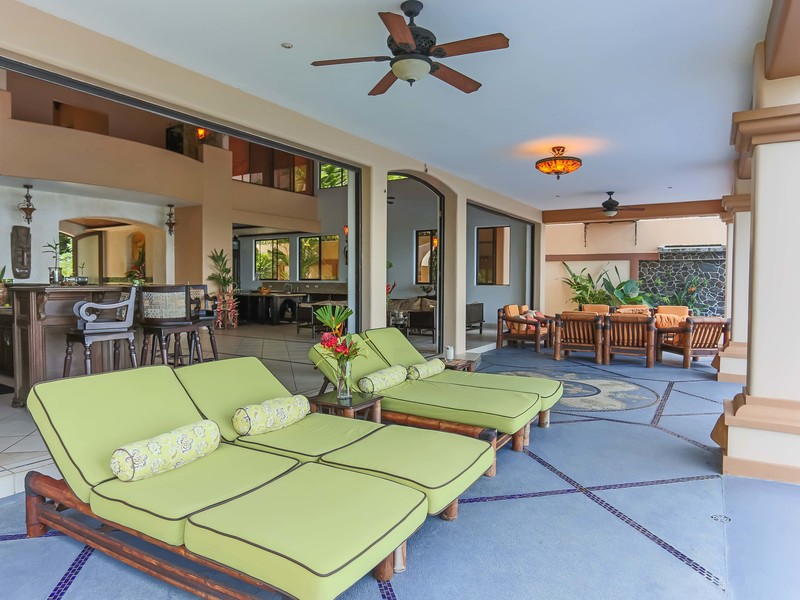 Extending out the sliding glass patio doors sits the mosaic tiled patio with loungers and sitting area, this is the optimal area to enjoy the sunset views. The 1,700 sq. ft. infinity pool finished with glistening imported blue glass tiles features shallow “beach” sections, a calming waterfall, a Jacuzzi and an outdoor shower. The ocean view framed by the surrounding rainforest, which extends off the infinity pool, will make your heart skip a beat.
