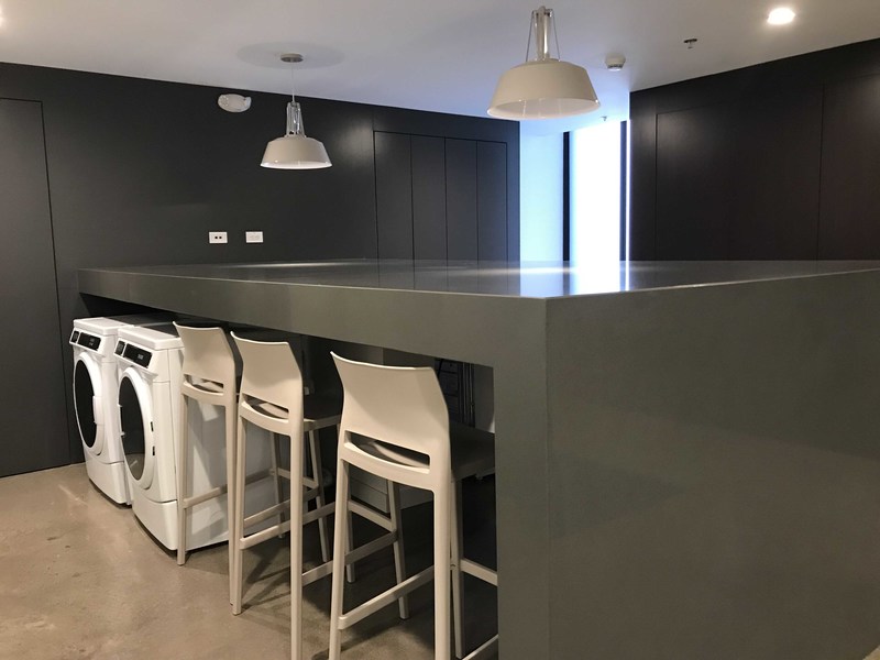 The whole apartment has contemporary finishes; laminate floors; curtains in all windows and blackouts in bedrooms.