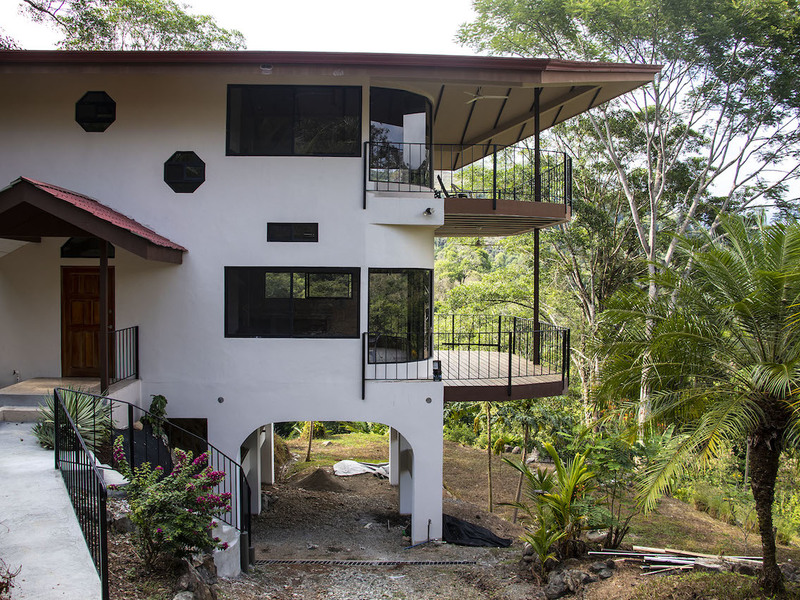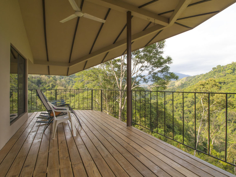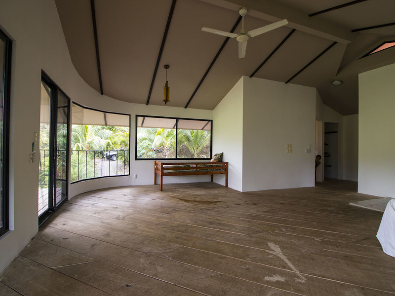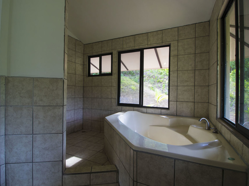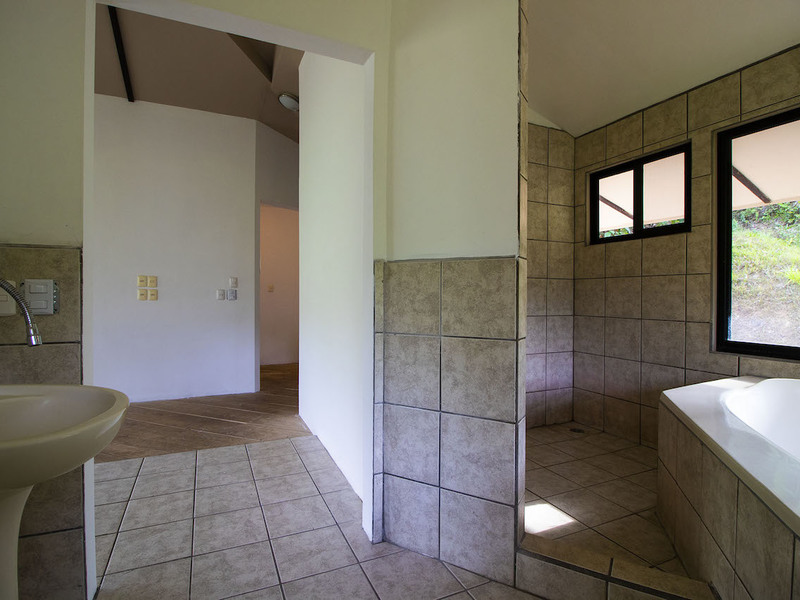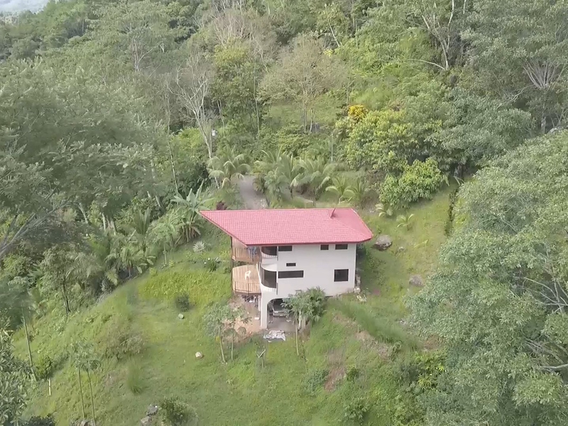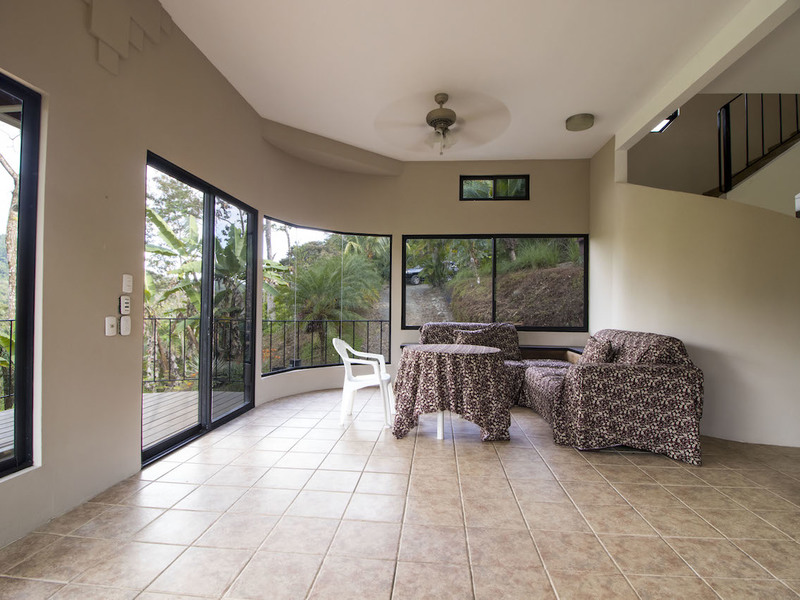 This simple home has spectacular mountain views, a private road to the Rio Guabo, abundant wildlife, and is located in Lagunas (upscale neighborhood near Dominical). It is a very private residence and yet is only 15 minutes from the beach. The house is just above the Rio Guabo with a private access road and a five minute walk to pools, waterfalls, and almost always spectacular wildlife sightings. The home has two large (300 sq ft) porches, one off the great room downstairs and one off the huge master bedroom upstairs. These porches are the real living space for the house! The yard is loaded with fruit trees and the garden is full of flowering plants.