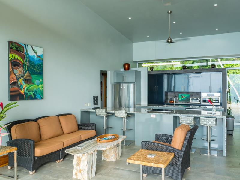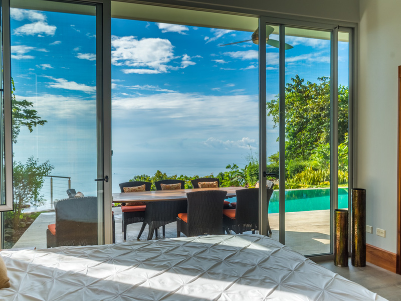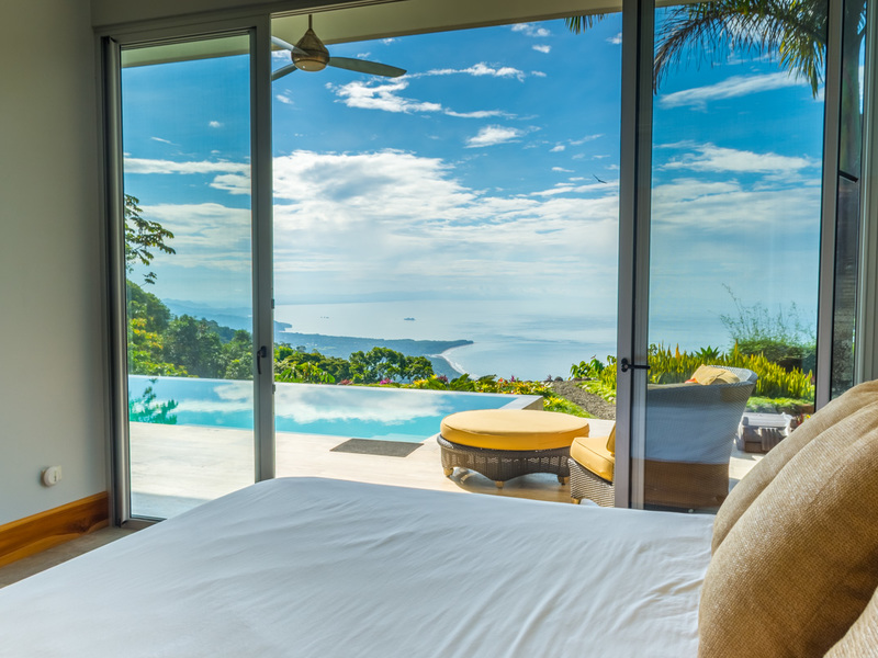 Tucked away in a lush area where monkeys traipse through the property daily, don’t be surprised if a family of monkeys greets you upon your arrival. You can see that this Costa Rica property for sale blends in well with the surrounding environment of lush green jungle, nature, and tropical birds and wildlife. As you enter the home, you can see the beautiful ocean views across the living room area and outdoor entertainment area. You notice the spacious gourmet kitchen to your right with an abundance of counter space. This open floor plan continues with a living room area full of natural light and all-glass windows and sliders that open to a fantastic outdoor entertainment area. The outdoor area has travertine stone and a zero-edge pool with incredible turquoise water and cloud reflections. You can choose from an area with a day bed, a large table, or one of the other outdoor areas to hang out and take in the incredible coastline views. This home has an ideal layout and use of the space for privacy. There are two master bedrooms with substantial open bathrooms located on either side of the kitchen and living room areas.