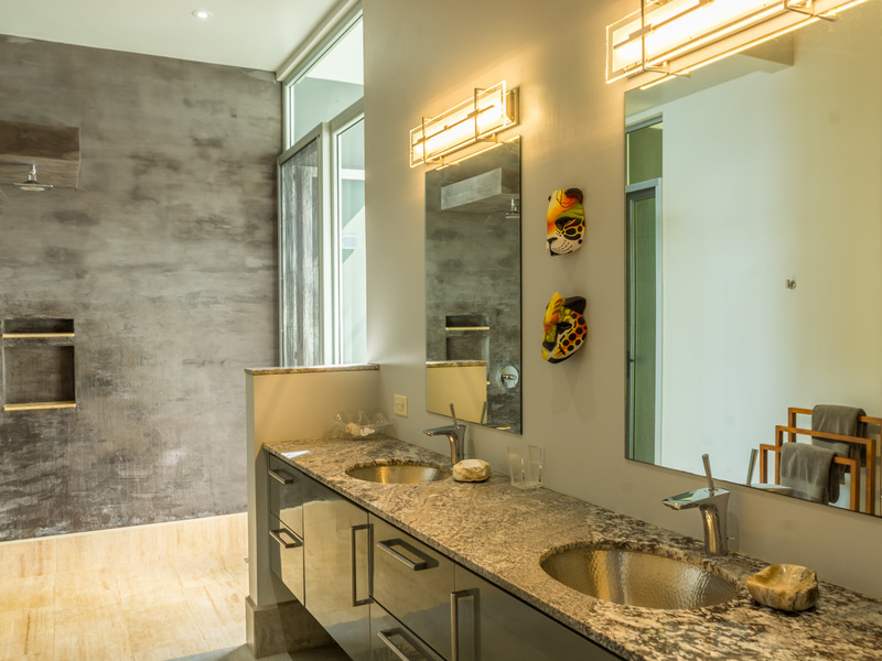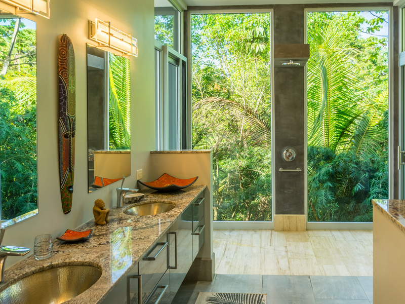 The large shower areas are configured with flexibility for an indoor or outdoor feel. One of your favorite parts of the house will likely be the jungle shower with lots of glass—an area that feels like monkeys, toucans, and other wildlife might join you at any moment. Wake up to the expansive coastline views that include the famous Uvita whale’s tail formation, islands and whitewater beaches, and the Osa Peninsula! Walk outside of your bedroom of this one-of-a-kind Costa Rica real estate, and you can meander through the walking trails as you experience increasingly incredible views. The outdoor area’s landscaping was designed to be low maintenance with walking trails and wonderful tropical plants. There is also a path down the ridgeline with fruit trees and more ocean views. The dynamic views and occasional occurrence of seeing and feeling clouds at eye level will have you in awe!