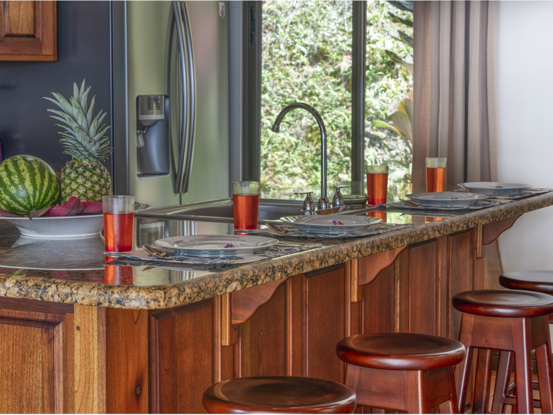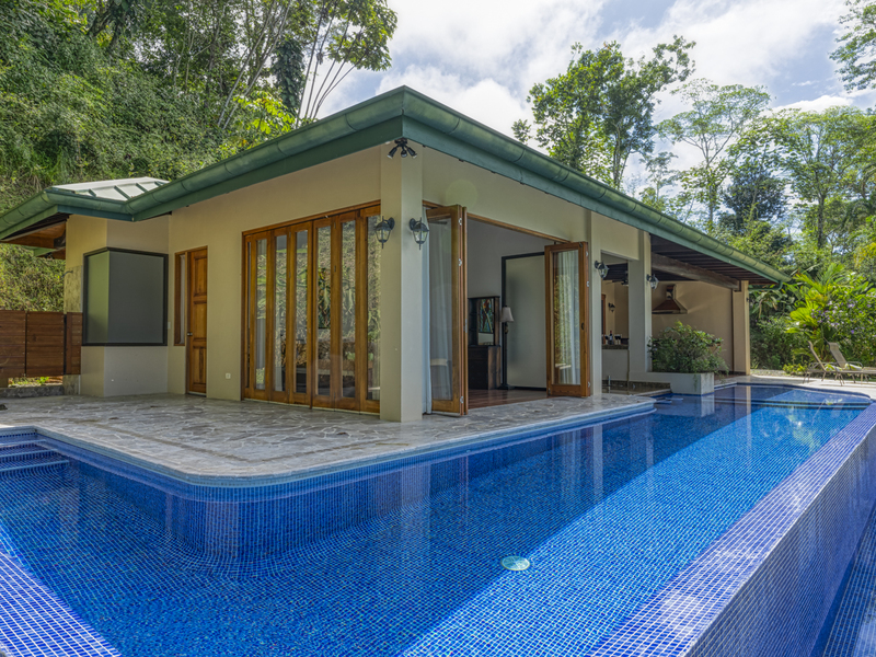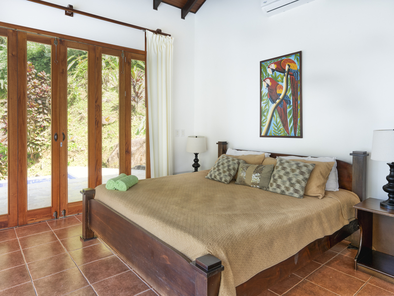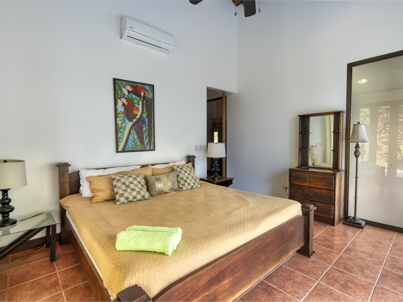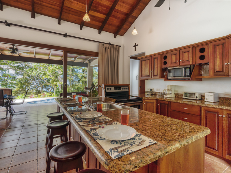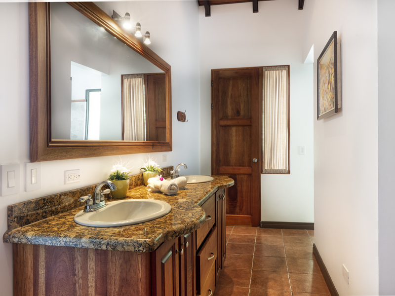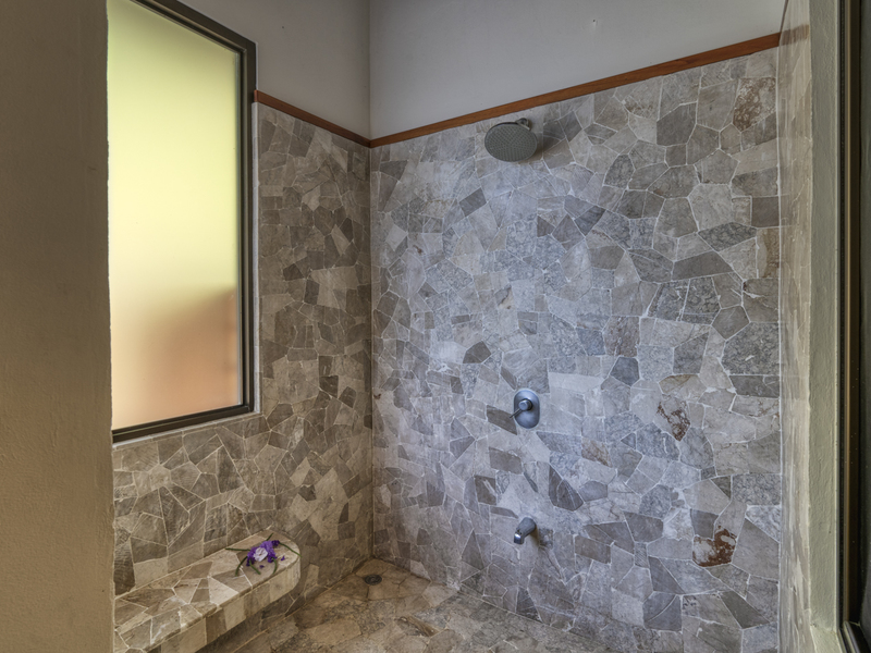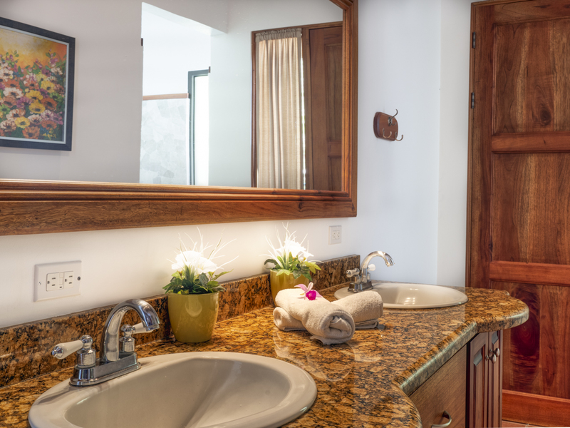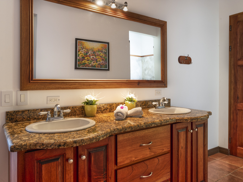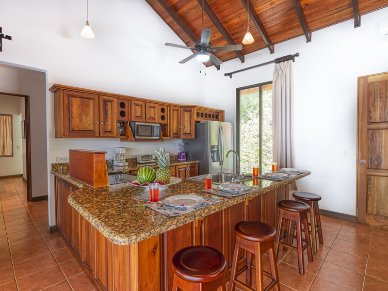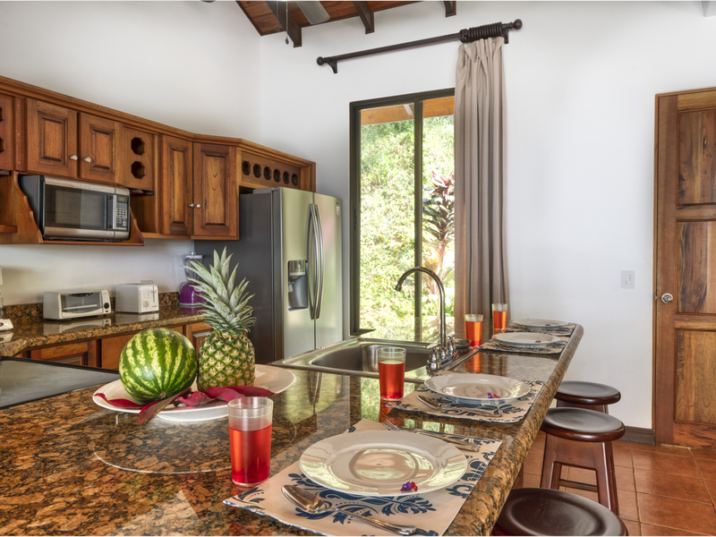 This 2-bedroom luxury villa will make you feel like you’re living in a tropical paradise with its private jungle setting. You can see stunning views of the lush tropical rain forest from every room, where you can see toucans and monkeys. The open floor plan of the eat-in kitchen and living room features modern décor and wood furnishings. The gourmet kitchen includes an eat-in granite breakfast bar, four barstools, wooden cabinetry, and stainless steel appliances. Pendant lighting and ceiling fans add to the ambiance. The living room includes a plush sofa and chair, a granite coffee table, and teak wood furnishings. Wooden doors lead out to the outdoor area.