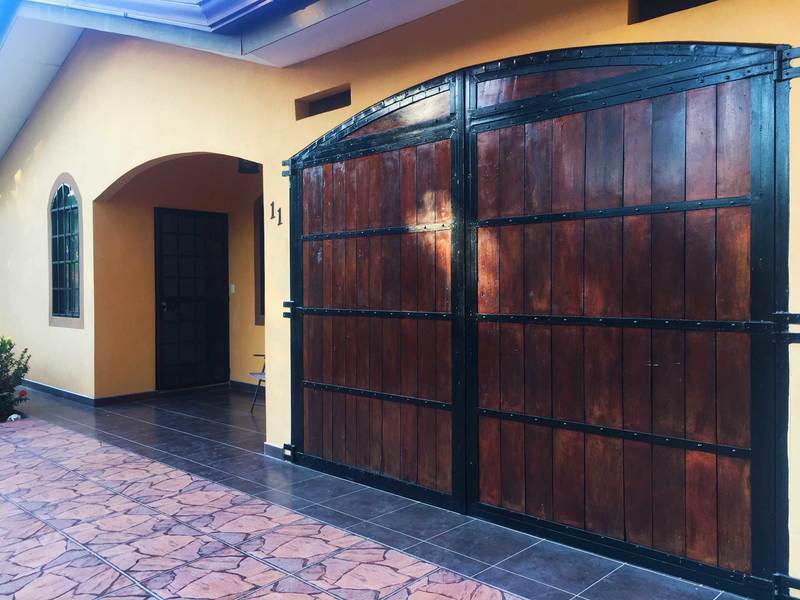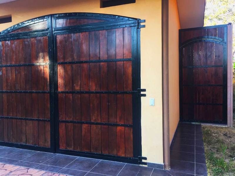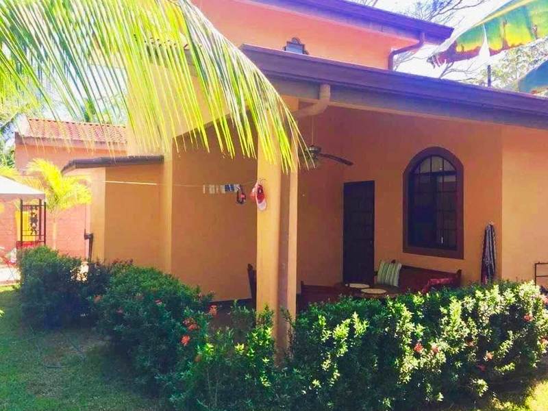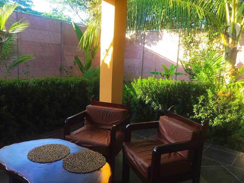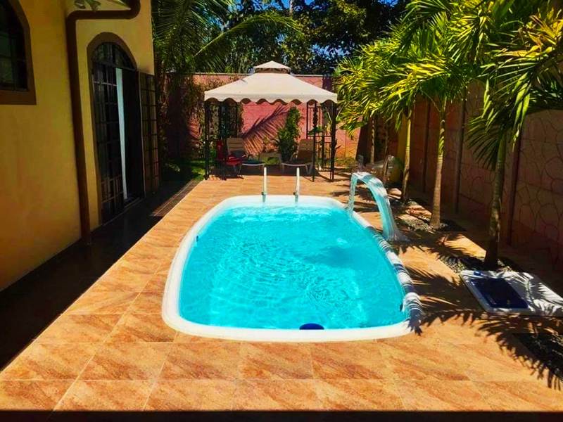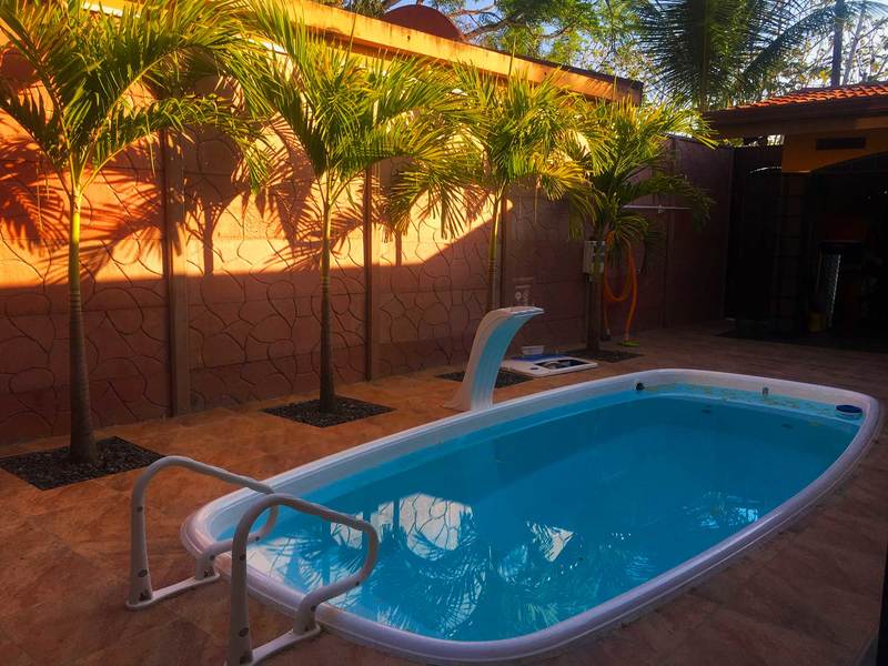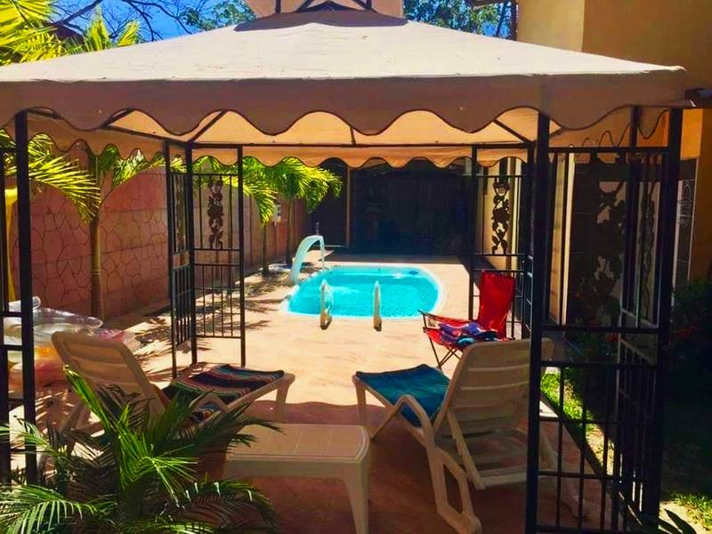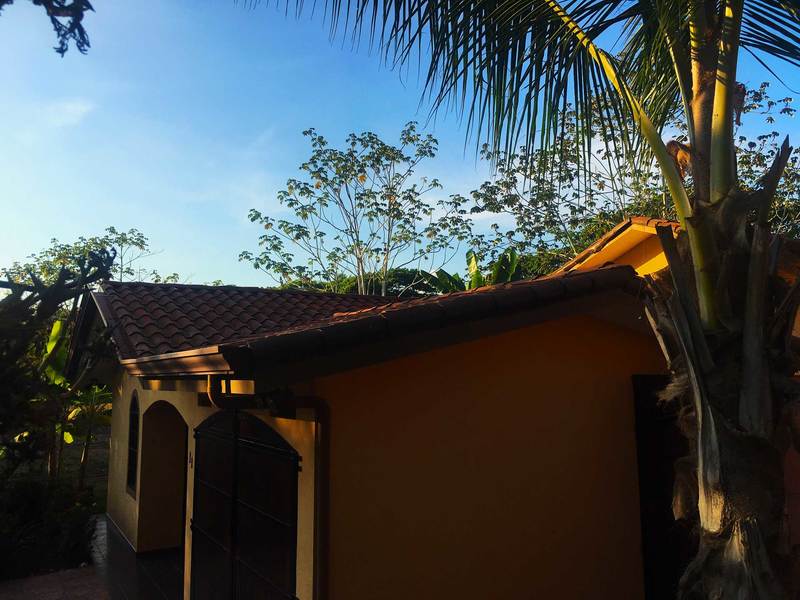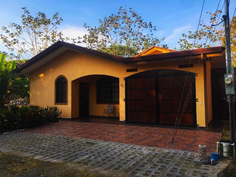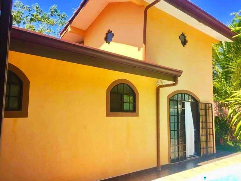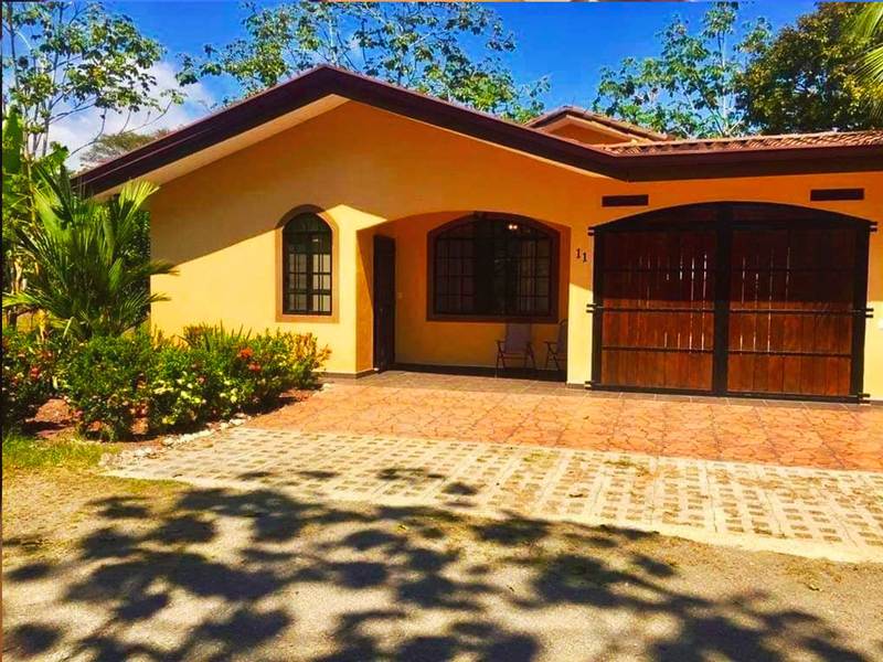 This tropical 2 bed 2 bath pool home is fully titled and located within a secure gated community just a short walk from the beautiful beaches of Esterillos Oeste on the Pacific Coast in Costa Rica. It is located at a secluded and wooded section within the community and beautifully landscaped with a nine foot decorative wall surrounding the home and grounds for additional privacy. The home was recently constructed just four years ago and it features 18 foot high ceilings in the living area and master bathroom too. It comes beautifully furnished with everything you need to enjoy your new beachy tropical lifestyle in paradise.