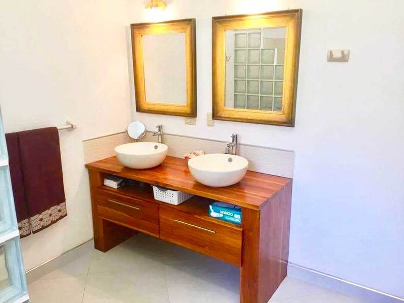 The roof is made of mold resistant panels and the pool is brand new with a waterfall feature to cool off in. It comes with a garage that can be used for vehicles, storage and or converted in the future to become a third bedroom or rental unit if needed. The kitchen is spacious and the cabinets are all made of durable teak wood, as are the bathroom cabinets too.