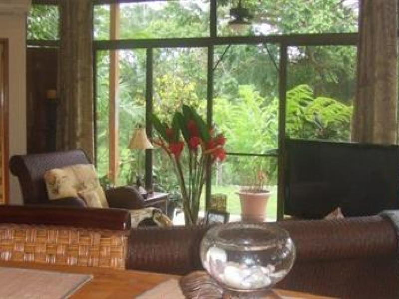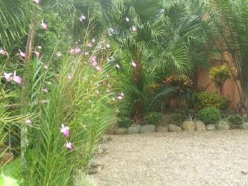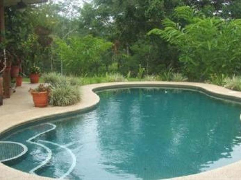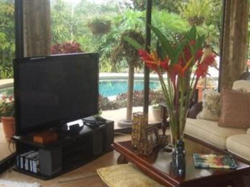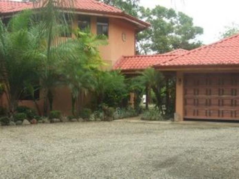 A true private estate situated on 177 acres close to the white beaches of Manuel Antonio and the new Marina Pez Vela. This luxury home features 2 Bedrooms, 3 baths, 2 car garage with attic, huge Rancho and pool area Upon entering the Private estate, there is a total secure security gate with touch key entrance. Following the road you will enter the property on a very private drive that is very well landscaped with tropical flowers and orchids. The main house features 1 guest bedroom with its own full bathroom, main living area and quaint kitchen overlooking the gardens and pool area. The upper level of the home features the very large master suite, wet bar, dressing area, large walk in storage area that he owners also use as a home office as well as a master bathroom with a tub for relaxing. The rancho is the main entertaining area with wet bar, sitting area and its own bathroom for the pool. The pool itself is inviting and is large enough for lots of friends and family. The 2 car garage is perfect for the rainy season as well as storage for all the needed adult toys. The property sits on over 1.5 acres and is part of the 177 acres that is all common grounds. There is a large horse stable with 10 horses and lots of land to ride ATV’s or just take a leisurely stroll to the river.