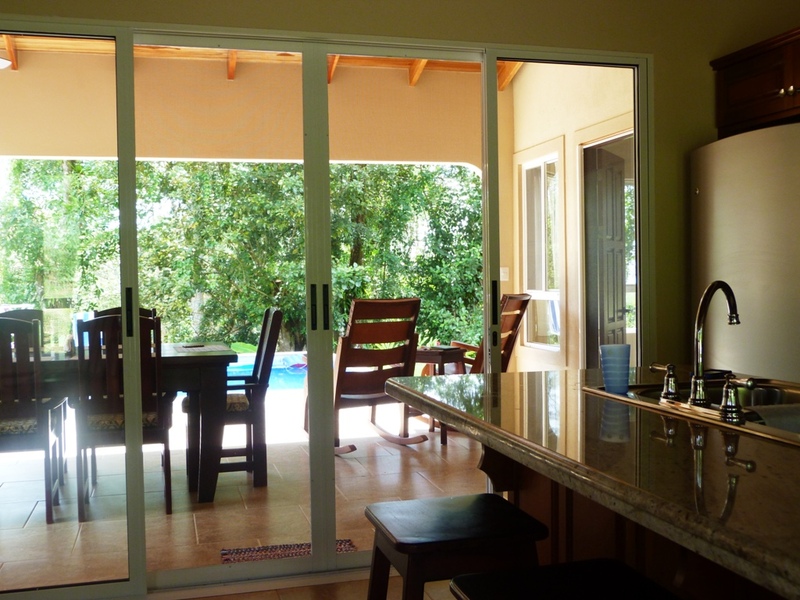 The house is built around the pool and large outdoor patio with 3 separate and private areas. The kitchen and living area are together as one piece. The brand new kitchen comes equipped with top of the line stainless steel appliances, granite counter tops and a breakfast bar. The comfortable living room next to the kitchen is great for watching TV or entertaining guests. As you walk out the patio doors you have a huge dining table and chairs overlooking the pool and the rainforest with an abundance of tropical birds.
