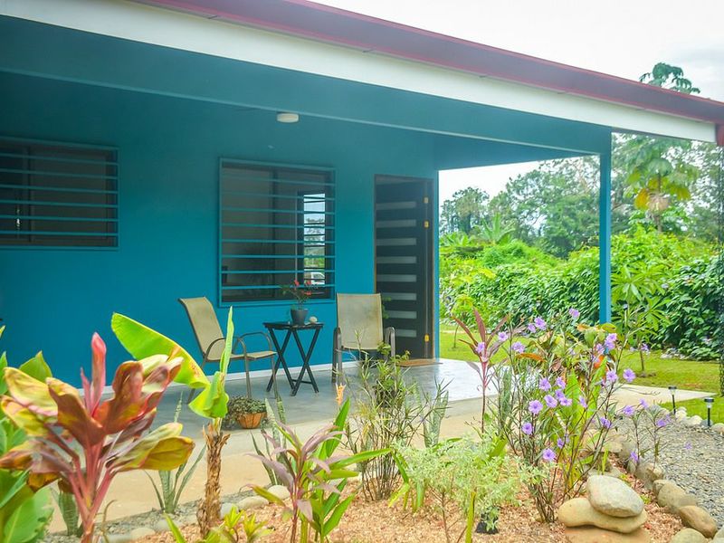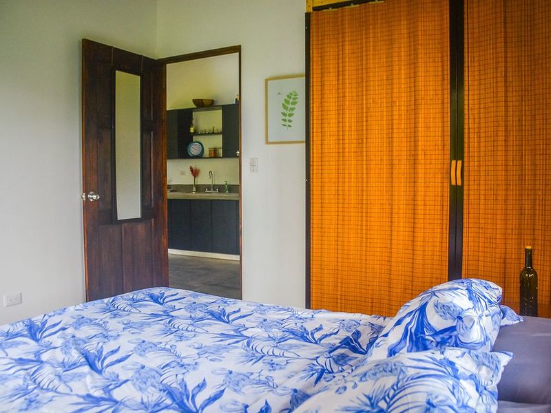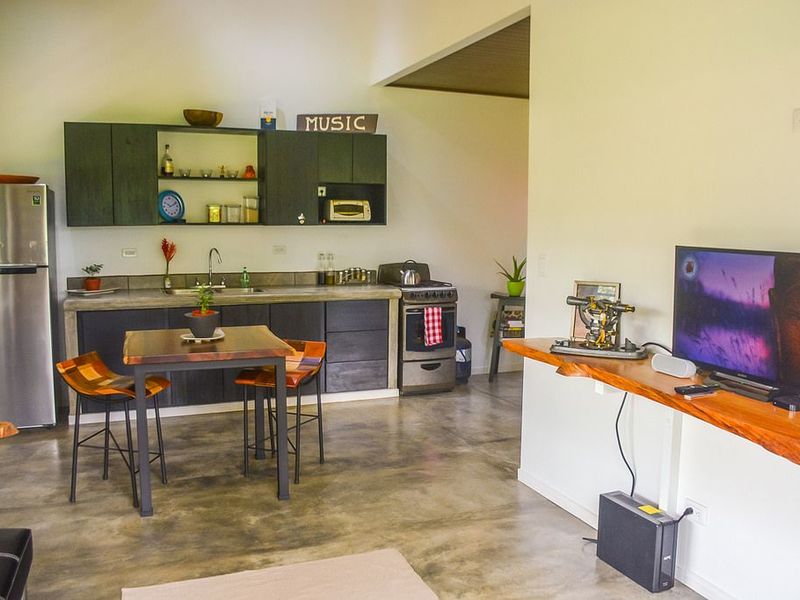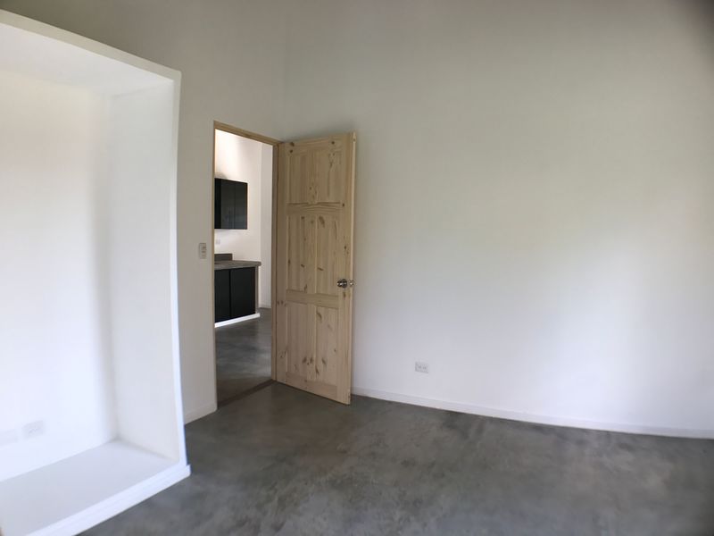 The duplex features 2 full units, each measuring 700 sq.ft. in living area. The interior open floor plan living area is finished with polished concrete floors and a galley style kitchen with locally sourced hardwood cabinets and concrete countertops. There is a full bathroom with shower and the bedroom is equipped with A/C. Eco-efficient hot water heaters serve each unit. The covered terrace area is a great spot for relaxing and enjoying the beautiful garden and mountain views. Each unit also holds a secure laundry and storage area.